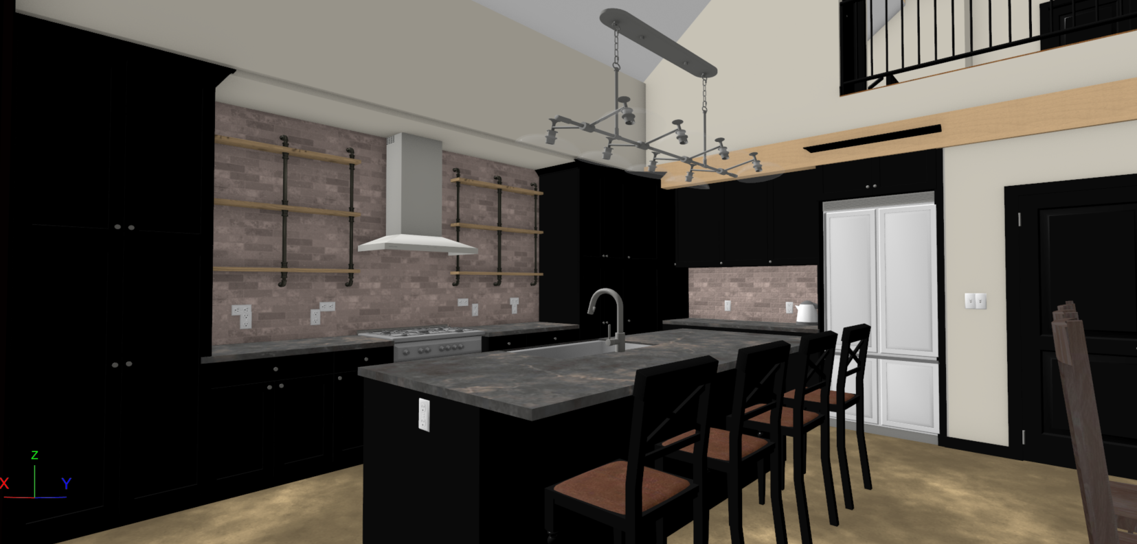 interior shot a modern kitchen with an elegant design featuring black cabinets and a sleek gray countertop the backsplash is a textured light brown brick adding warmth and depth the open shelves and metal piping create an industrial chic vibe the walls are painted in soft beige complemented by the warm wood beam on the ceiling the room is illuminated by a modern light fixture in matte silver enhancing the sophisticated atmosphere the floors are finished with a light brown polished wood for a cozy feel the kitchen island includes contemporary high backed black chairs with dark brown cushioned seats exuding a stylish yet inviting ambiance architecture