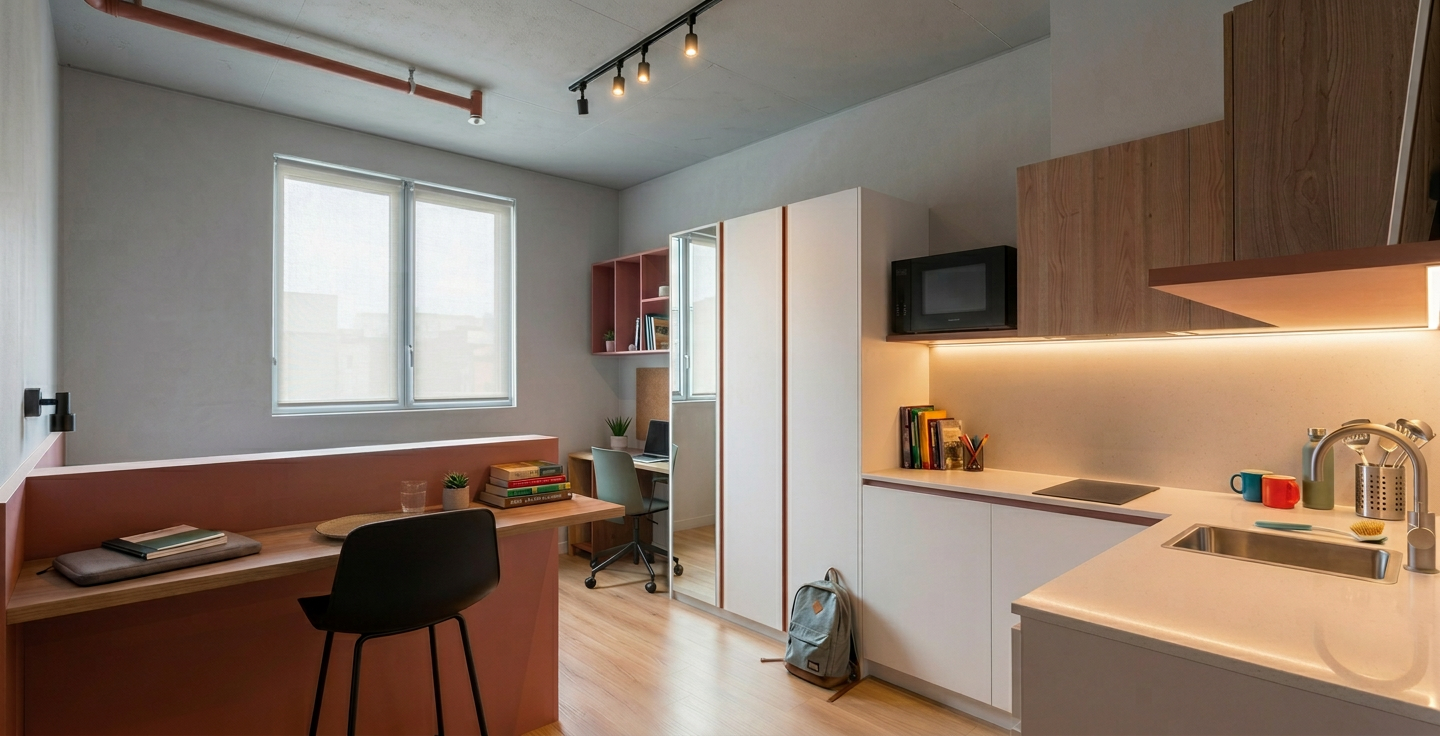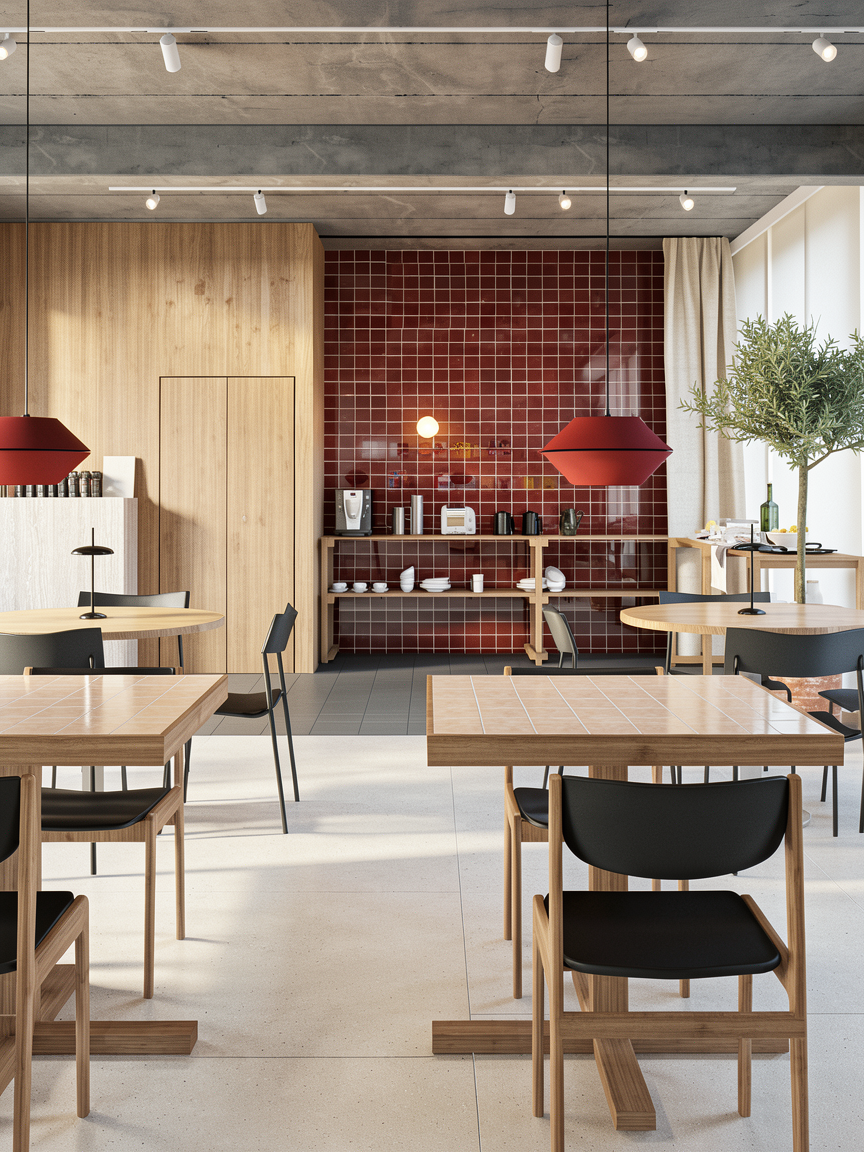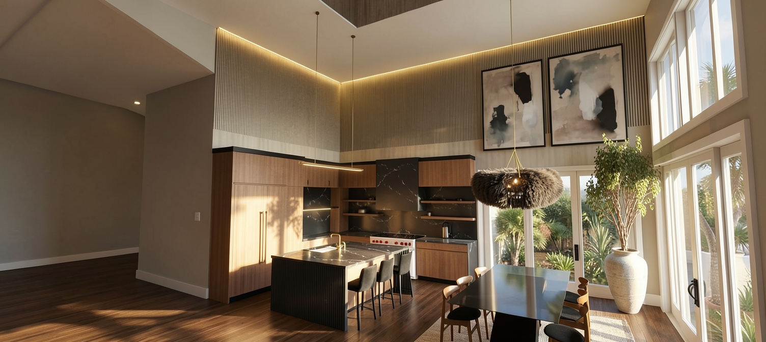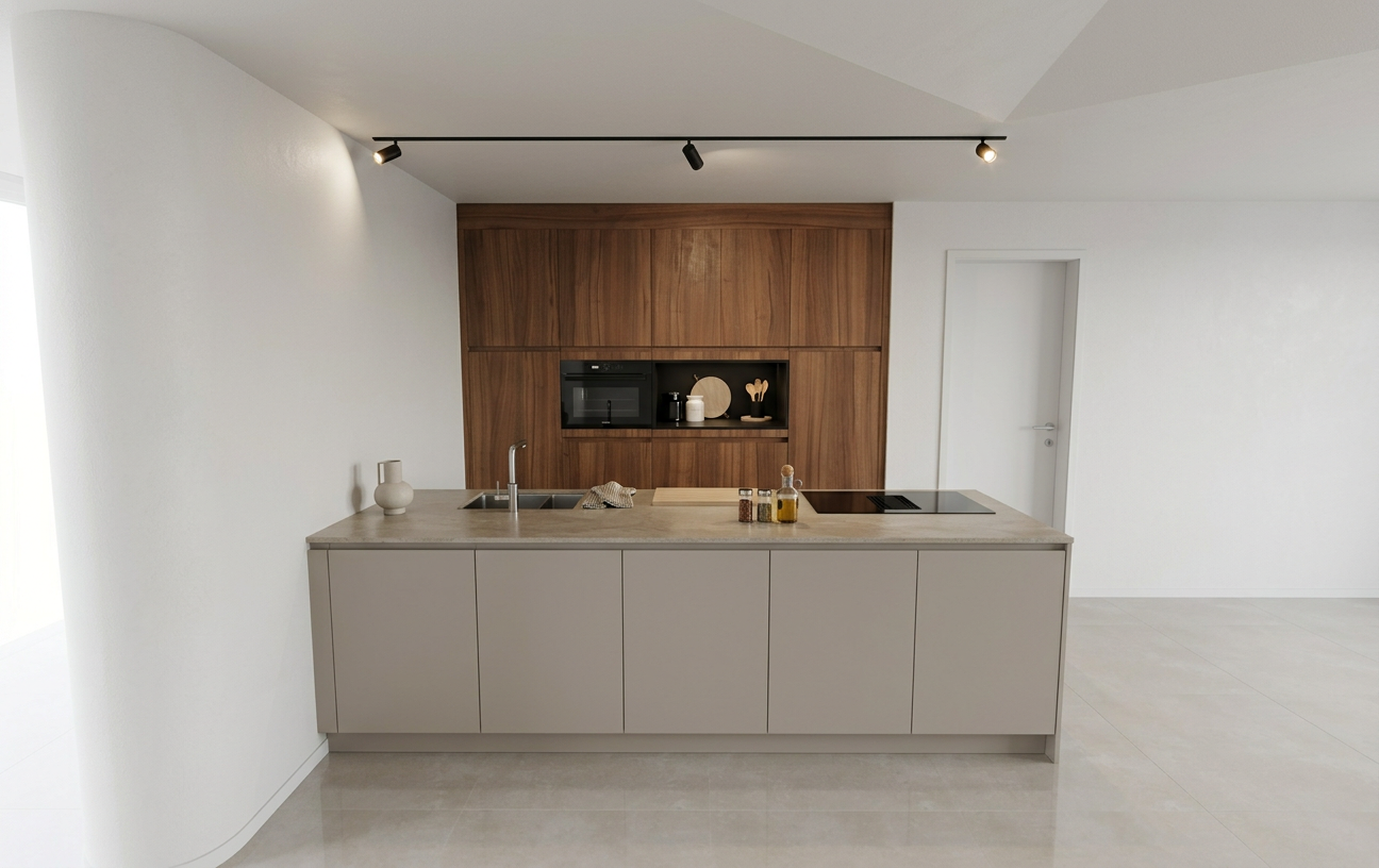 enhance the realism of this architectural visualization without changing any materials colors textures finishes furniture layout proportions or design elements keep all existing materials and color tones exactly as they are improve photorealism by refining natural lighting global illumination soft shadows subtle reflections accurate light bounce and realistic exposure add physically accurate light behavior micro contrast depth and subtle imperfections very delicate surface irregularities fine texture detail while preserving the original look improve realism through physically correct daylight simulation soft contact shadows realistic ambient occlusion subtle material roughness refinement without altering material type or color enhanced depth of field very subtle natural cinematic but natural color grading no color shift high dynamic range lighting do not redesign restyle recolor replace materials or modify objects maintain the exact same design only increase realism and photographic quality output should look like a professional architectural photograph ultra realistic natural balanced high end visualization scene is iluminated by artificial light table top is made from 10x10 white creme tile