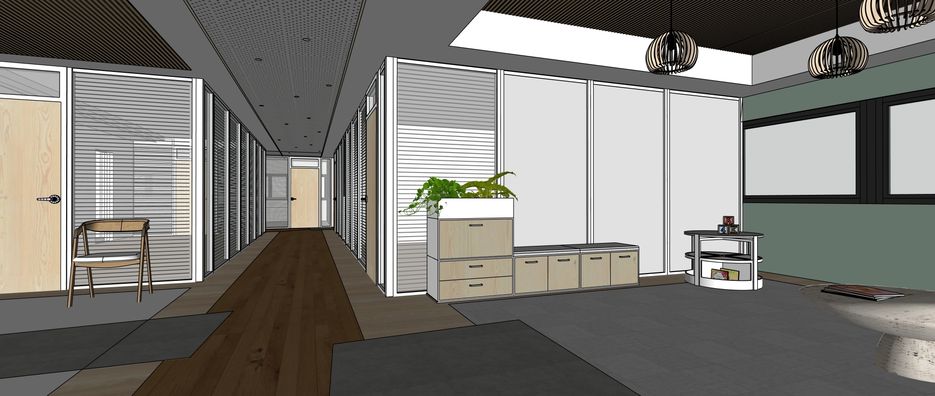 maintain geometry le faux plafond de la salle d attente est en lattes de bois parall le aux fen tres les menuiseries des fenetres sont noires les structures des cloisons mobiles et vitr es sont blanches les diff rents sols sont tous au m me niveau le palfaond du couloir est balnc m tallique perfor et de chaque cot du plafond m tallique des bandes led sont c lair es