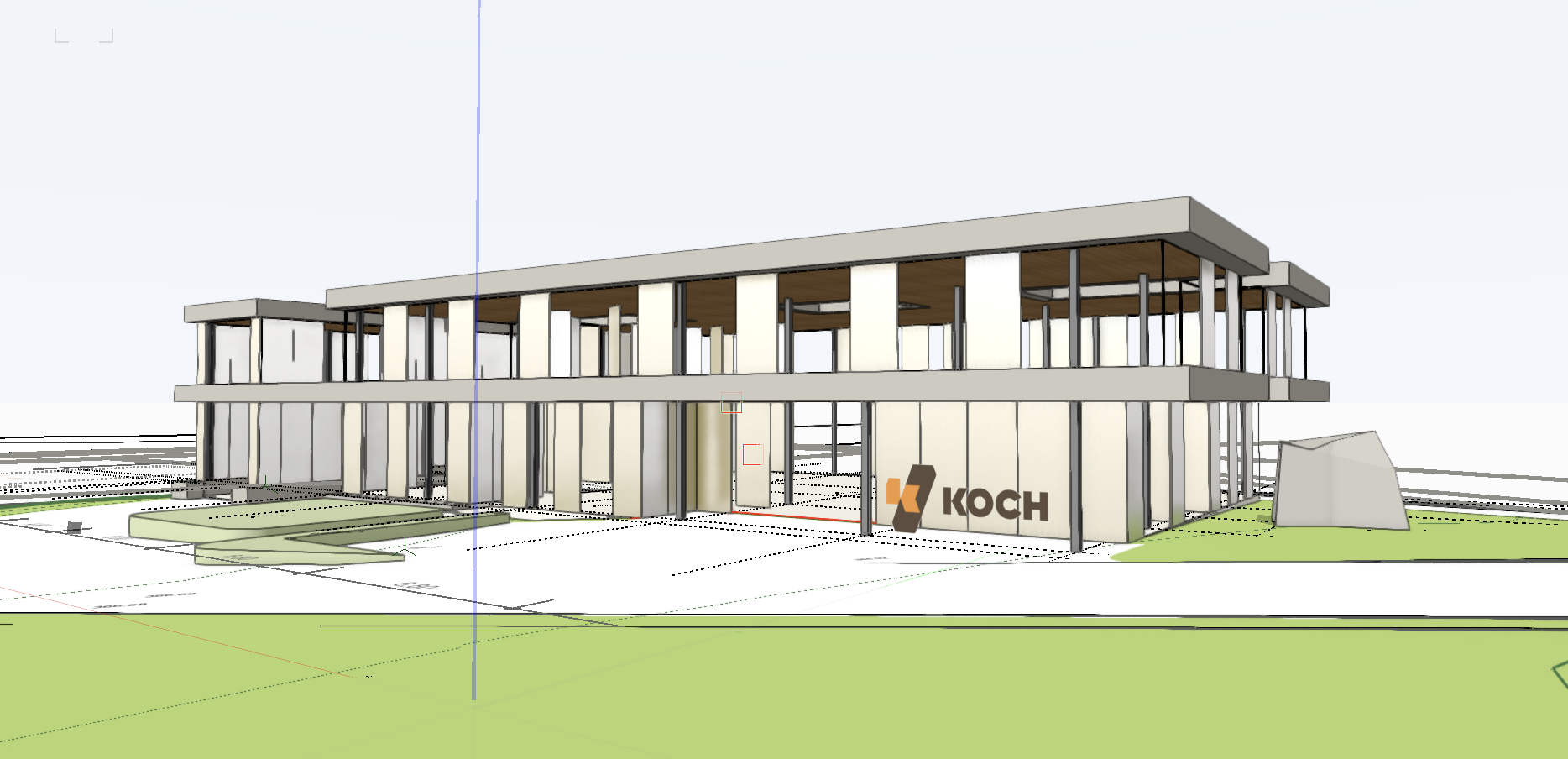 modern commercial building two story office structure cantilevered roof slabs light rock facade extensive ribbon glass windows interior wood ceiling panels paved entrance area lush green grass and big rock at the right elevation cloudy sky with sunlight