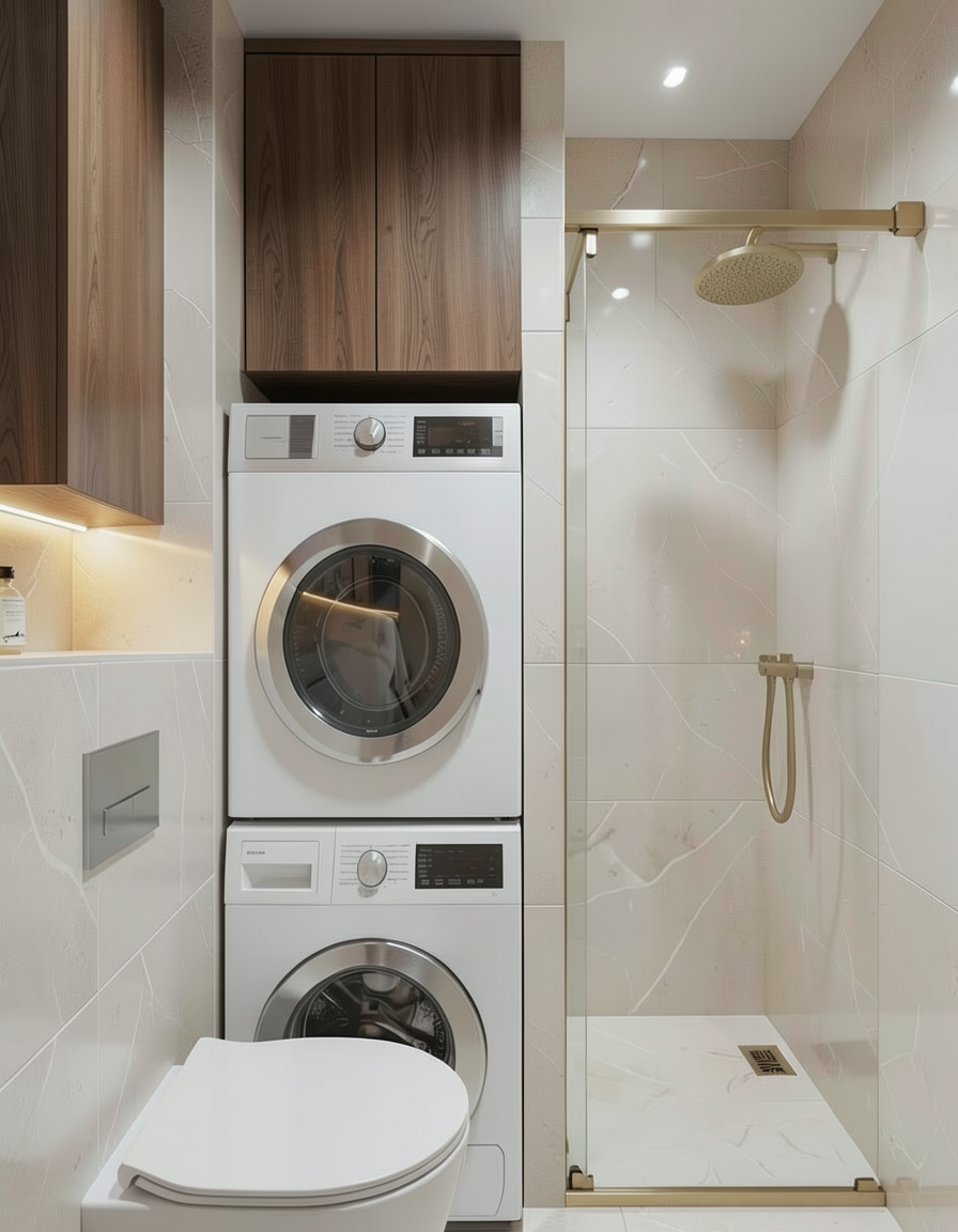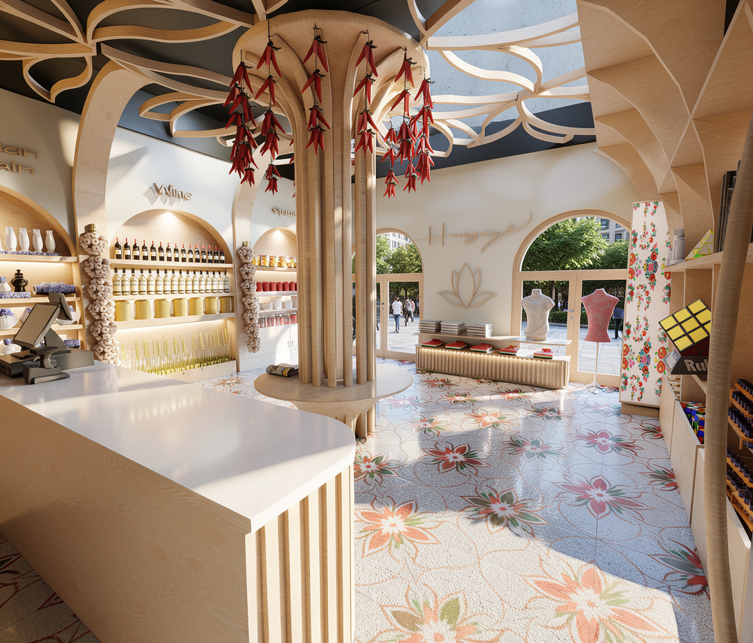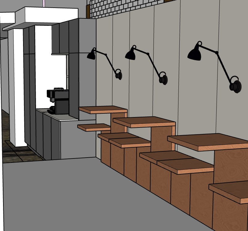 render a modern cozy caf interior with minimalistic design use soft warm lighting to create a welcoming atmosphere incorporate light gray walls and a white ceiling design wooden benches and tables with a rich walnut brown finish add black sleek wall mounted lamps for a touch of industrial style introduce dark gray cabinets and add a shiny black coffee machine include a textured gray brick wall in the background for added depth ensure the floor is a dark polished wood to complete the chic inviting look