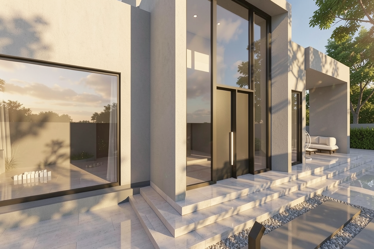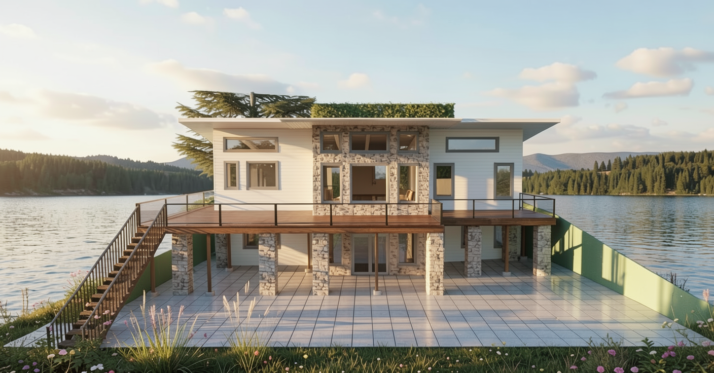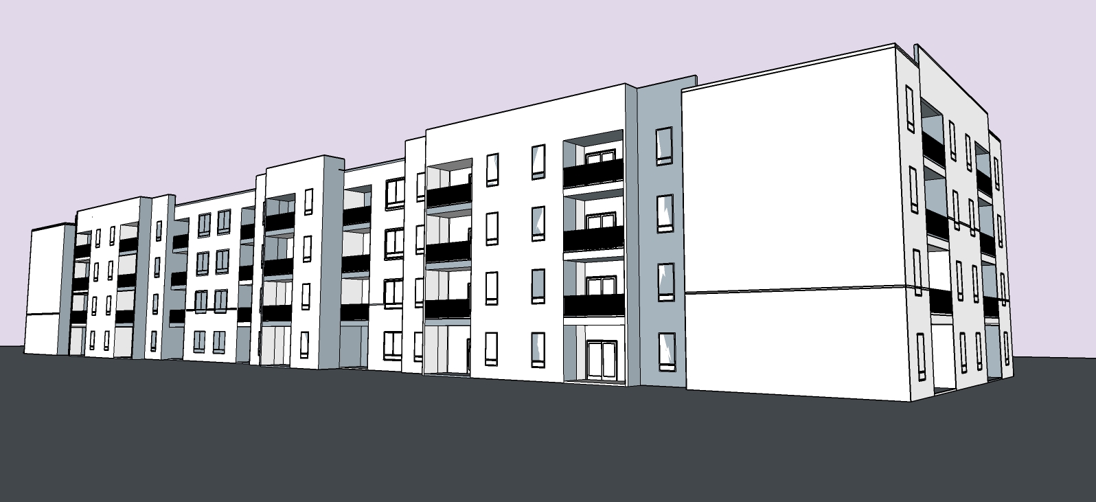 provide a photorealistic rendering of this apartment building complete with a urban street scene and landscaping bright sunny day with puffy clouds in the sky add people and cars to create a sense of energy