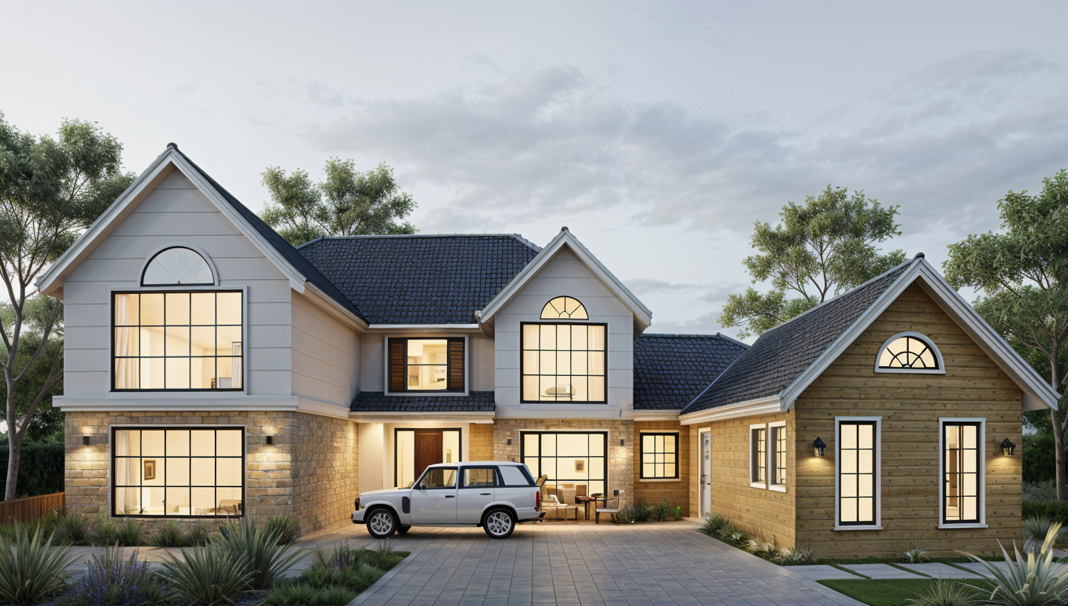 this is a model of a house the upper parts must be beidge light brown very smooth finish with horizontal key lines the parts with brown stone should be yellowish brownish rough rectangular stone add interior creamish warm lighting low brightness add few trees in background and vegetation to give it context car is a modern range rover