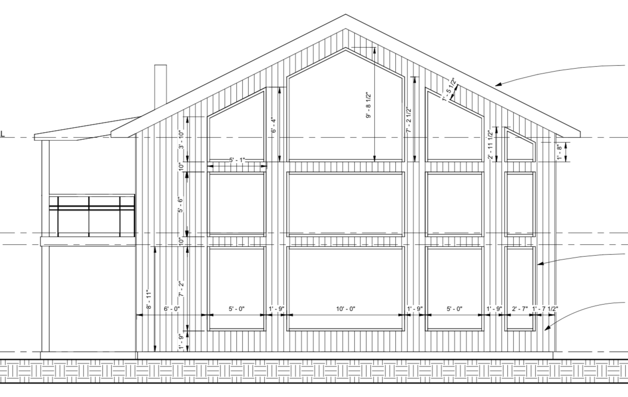barndominium interior shot convert this front exterior elevation into an interior perspective render by virtually cutting the building open viewpoint standing inside the building facing the front elevation interior structure 19 foot tall side walls vaulted ceiling following the roof shape shown in the elevation on the right side of the image interior view place a large floor to ceiling natural stone fireplace similar to a luxury mountain lodge yellowstone style great room the fireplace must be massive dominating the wall corner with thick stonework deep hearth and heavy timber mantel use the window layout and proportions from the elevation and treat them as full height interior windows style warm luxury lodge western rustic modern ranch interior lighting strong natural daylight from windows warm interior light from fireplace output photoreal architectural visualization ultra detailed materials architecture