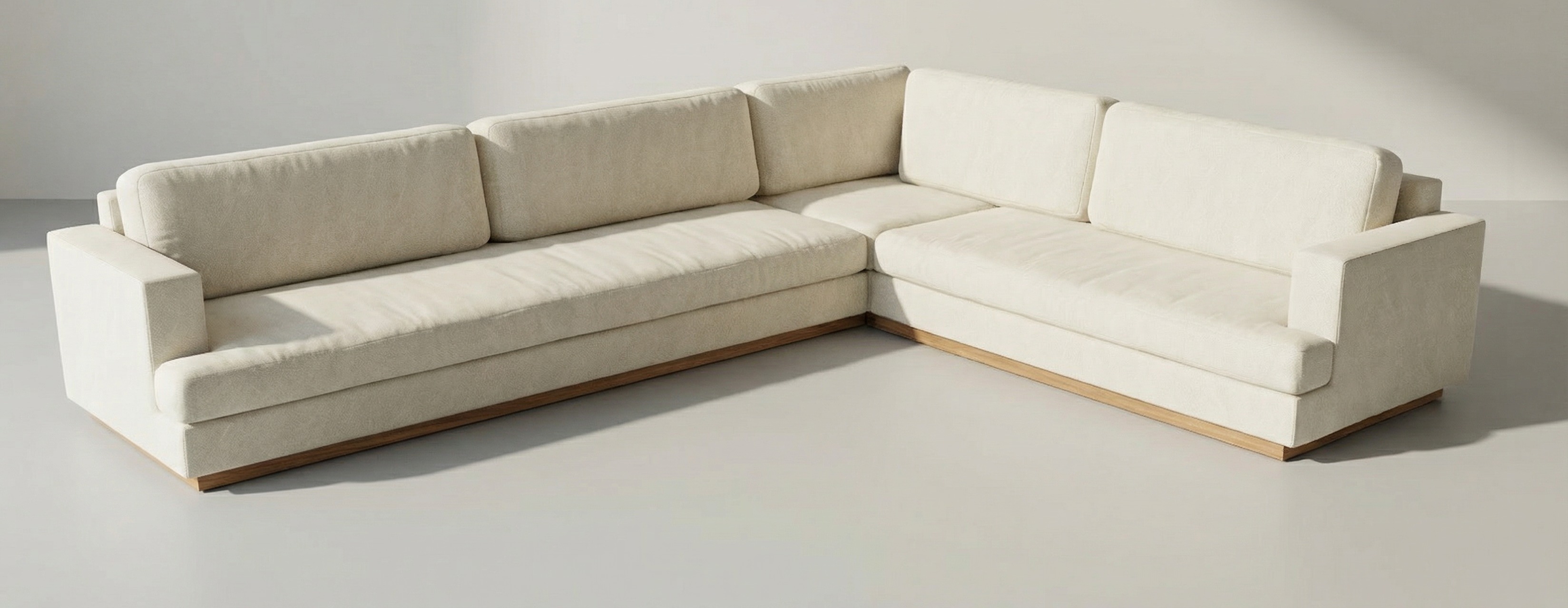 refine the existing render while maintaining the exact geometry layout and camera angle do not redesign the sofa lighting adjustments reduce overall brightness and exposure eliminate harsh direct light and strong highlights use softer diffused ambient daylight with a more even light distribution introduce gentle shadow gradients instead of sharp shadows fabric adjustments tone down brightness of the upholstery to a warmer slightly deeper cream less white reduce the appearance of loose or wrinkled fabric make upholstery more tailored and structured with tighter tension keep subtle texture but avoid overly pronounced fuzziness or noise back cushions increase back cushion height slightly for better proportion maintain clean tailored edges not overly soft or slouchy keep alignment consistent and structured overall refinement maintain a clean high end tailored look reduce exaggerated softness this should feel structured but still comfortable keep wood plinth natural and subtle not overly saturated strict instructions do not change sofa design or proportions beyond slightly increasing back cushion height do not add pillows or accessories do not alter camera angle or composition only refine lighting material tone and cushion proportion