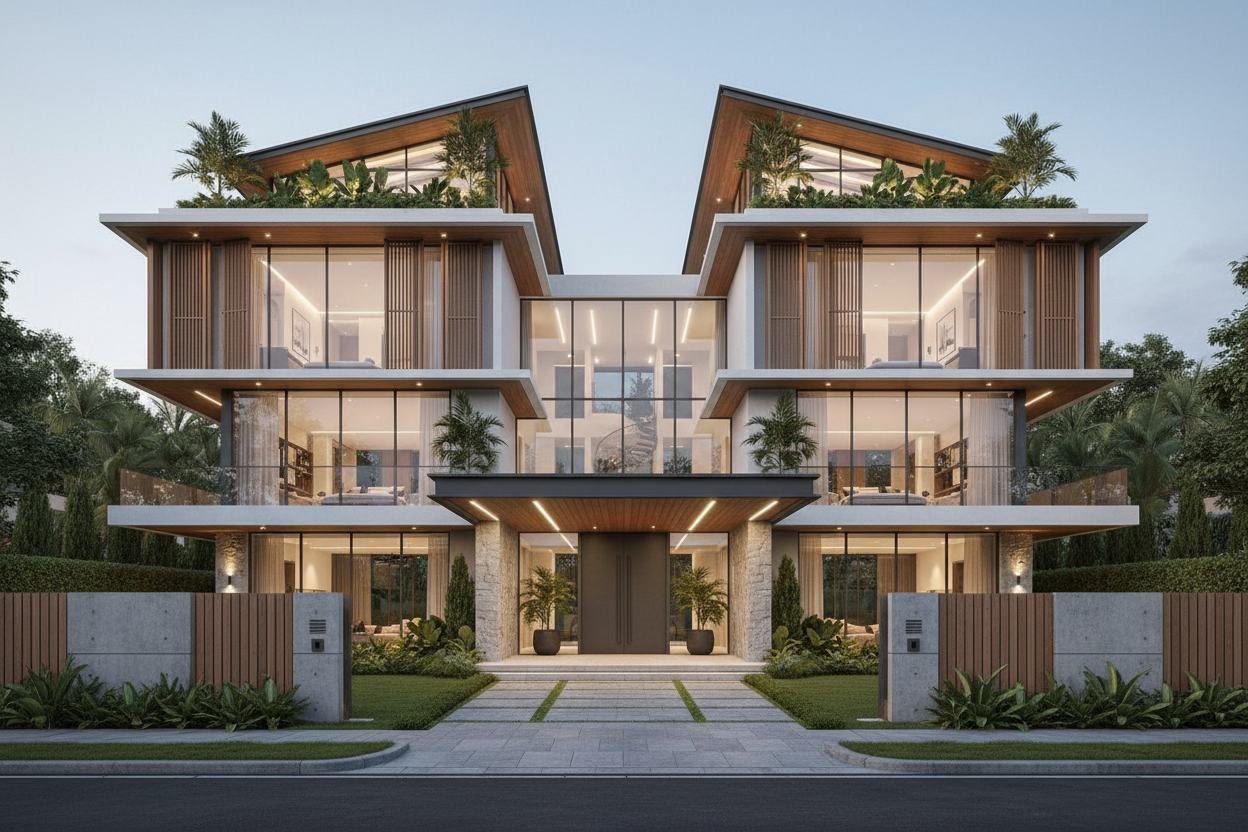 i don t like your suggested design please provide another design remove the houses at the side of the intended house look at all the references images and take their design and architecture language and provide me with a design similar to their design language however ensure that the following parameters comply 1 4 storey house design 2 28m wide from left to right 3 19 m depth from front to back 4 2 m setback on left and on right from building line to boundary wall 5 7 5 m setback from front of building to entrance wall 6 5 5 m wide gate at center of front boundary wall and boundary to be 1 8m high 7 house needs to be symmetrical main entrance of house to be in center and left and right fa ade design to be quite identical 8 15 5m height no swimming pool 9 on the 4th floor set back 4 5m instead of 2 m from the boundary wall provide a front fa ade design for the house