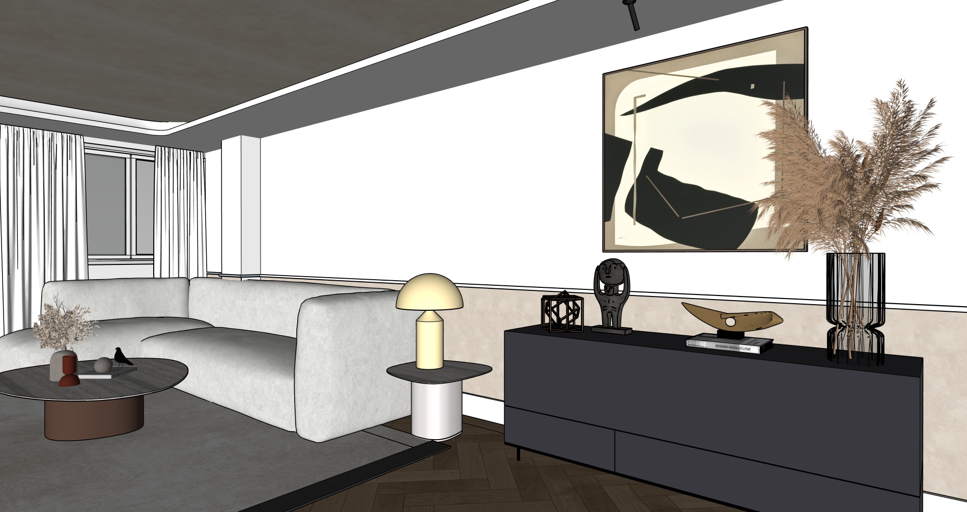 crea una imagen fotorealista a partir de esta de sketchup realza las texturas e iluminacion para que queda todo natural y realista