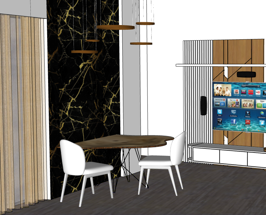 contemporary interior shot lunch table marble wall wooden floor television lush light fitting bright room architecture