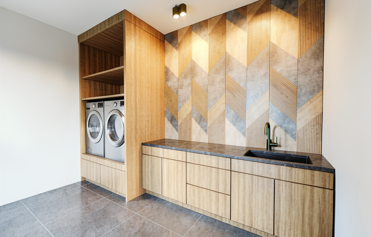 walls behind the tub are white shiplap cabinetry is light maple wood