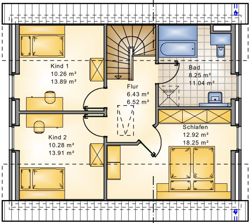 convert this floor plan into a realistic isometric 3d view of a full house show the space from an elevated angle with furniture walls and details visible photorealistic 3d floor plan render based exactly on the provided attic floor plan of a house with gable roof satteldach strict geometry rules keep layout 100 identical do not change walls doors windows do not change proportions sizes or layout all areas must match exact dimensions roof very important satteldach roof must be a symmetrical gable roof slopes on both sides left and right ridge in the middle use anthracite roof tiles only clean realistic roof geometry do not create flat roof create mono pitch roof create pagoda roof texts labels critical keep all room names exactly schlafen kind 1 kind 2 flur bad keep all room sizes m place labels clean and centered do not rename or remove labels bathroom very important bathtub shower toilet sink must match exactly no repositioning no additions style modern clean high end real estate visualization photorealistic 4k bright daylight warm interior lighting floors bathroom anthracite tiles all other rooms light wood parquet walls pure white interior beds fully dressed with exactly 2 pillows furniture wood or white desks always with chair chairs light colors plants subtle stairs always natural wood tone attic details very important show sloped ceilings on both sides symmetrical roof slopes ridge centered above floor plan integrate knee walls drempel windows must match exact positions no flat ceiling no asymmetrical roof lighting natural daylight warm interior lighting soft shadows cozy and realistic negative rules no wrong roof type no asymmetrical roof no flat roof no layout changes no scaling errors no missing labels no invented bathroom elements use the same furniture as shows on the plan do not change the orientation of the floorplan