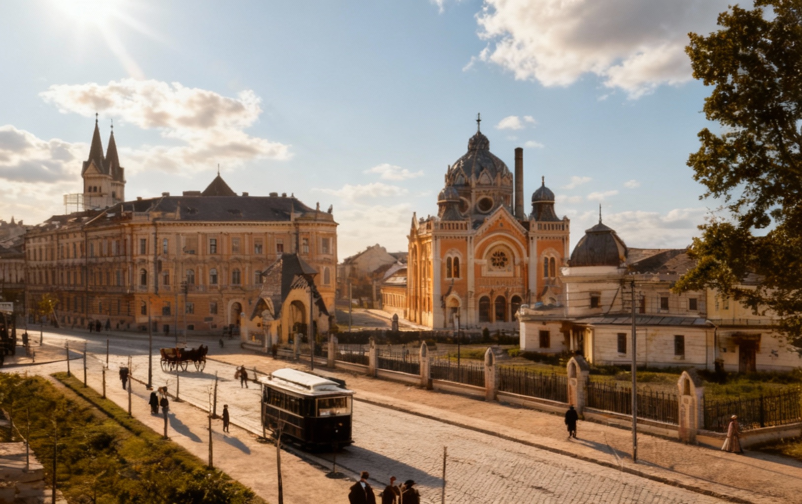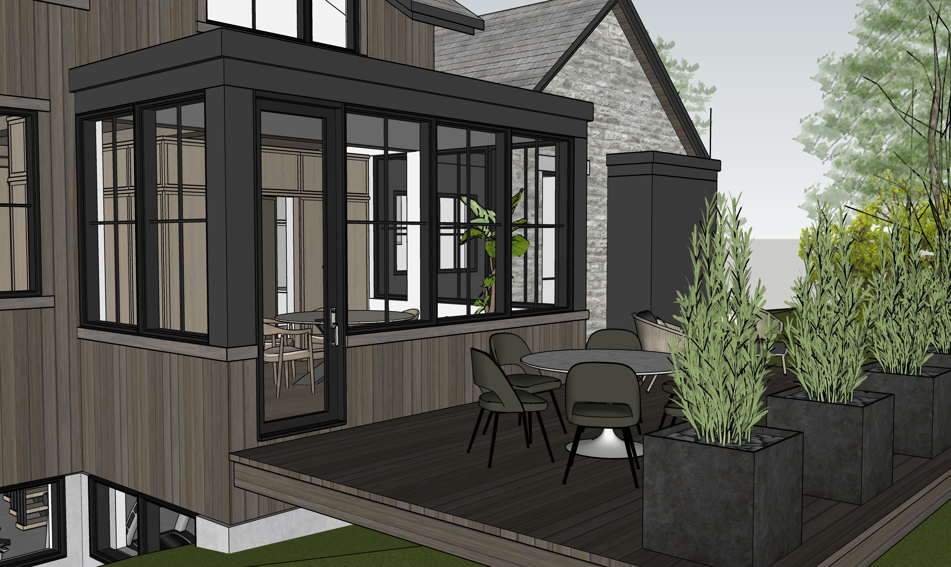 a luxurious and refined home with mature trees in foreground with the terrace bath in sof sunlight