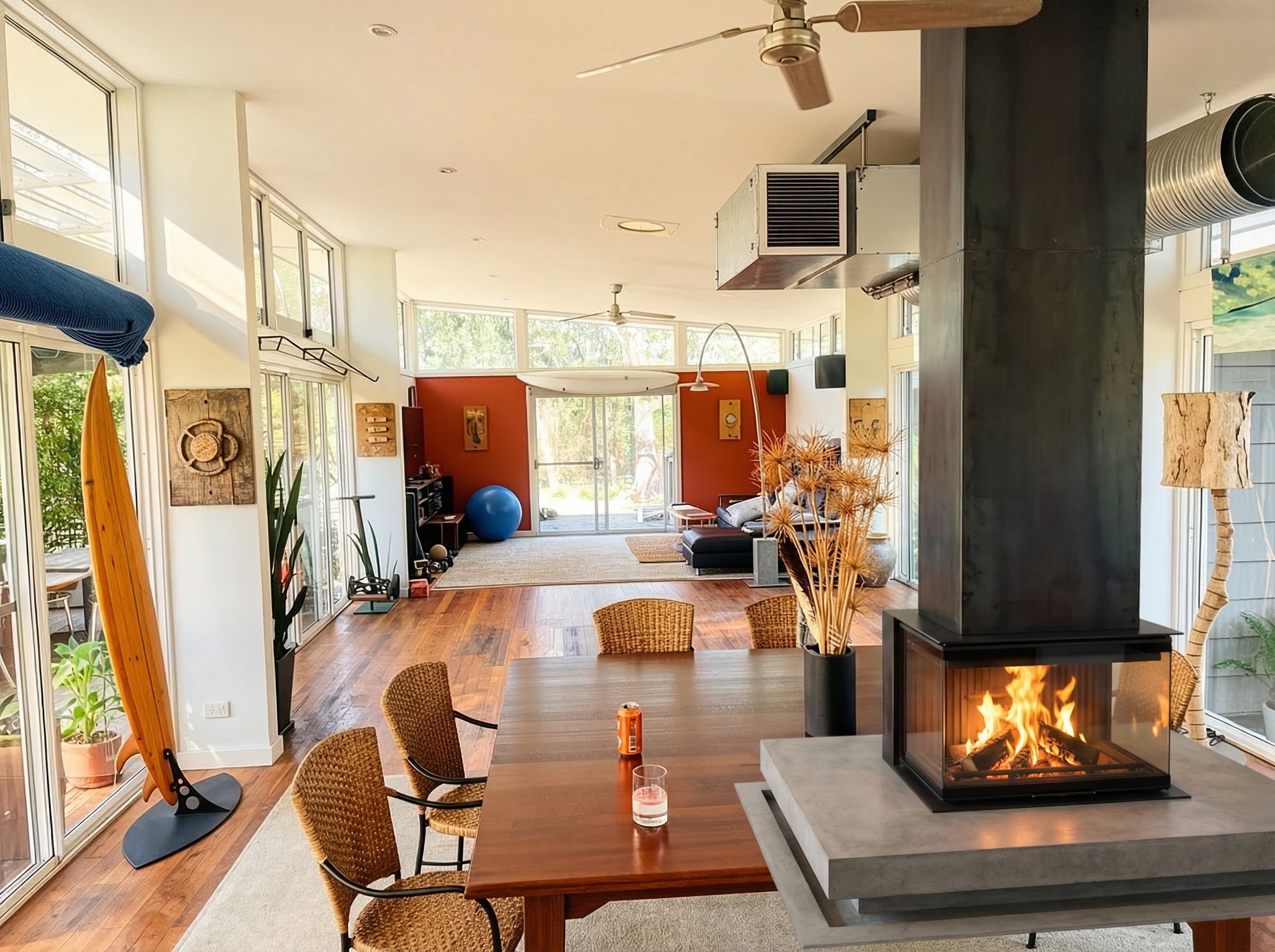 rendering instruction warm scandinavian interior create a warm scandinavian style interior render with soft natural light and a cozy atmosphere flooring light oak wood parquet small square tiles installed at a 45 degree angle diagonal layout walls painted in pantone 9081 c matte finish dining table and bench made of light oak wood add high density foam cushions seat and backrest in a soft grey tone ceiling flat pure white matte finish on the right side of the image a large floor to ceiling window with access to a narrow balcony 1 2 meters deep the balcony floor is brick with a white parapet place plants behind the glass railing outside include trees with soft natural daylight to the right of the table a scandinavian style armchair upholstered in gray fabric with light oak wooden legs add a cowhide rug and a coffee table with light oak legs and a glass top decorate the walls and overall scene with scandinavian style artwork and frames keep the styling minimal natural and cozy using warm lighting and soft shadows atmosphere bright but warm natural daylight coming from the right side soft contrast realistic materials subtle texture detailing hygge aesthetic