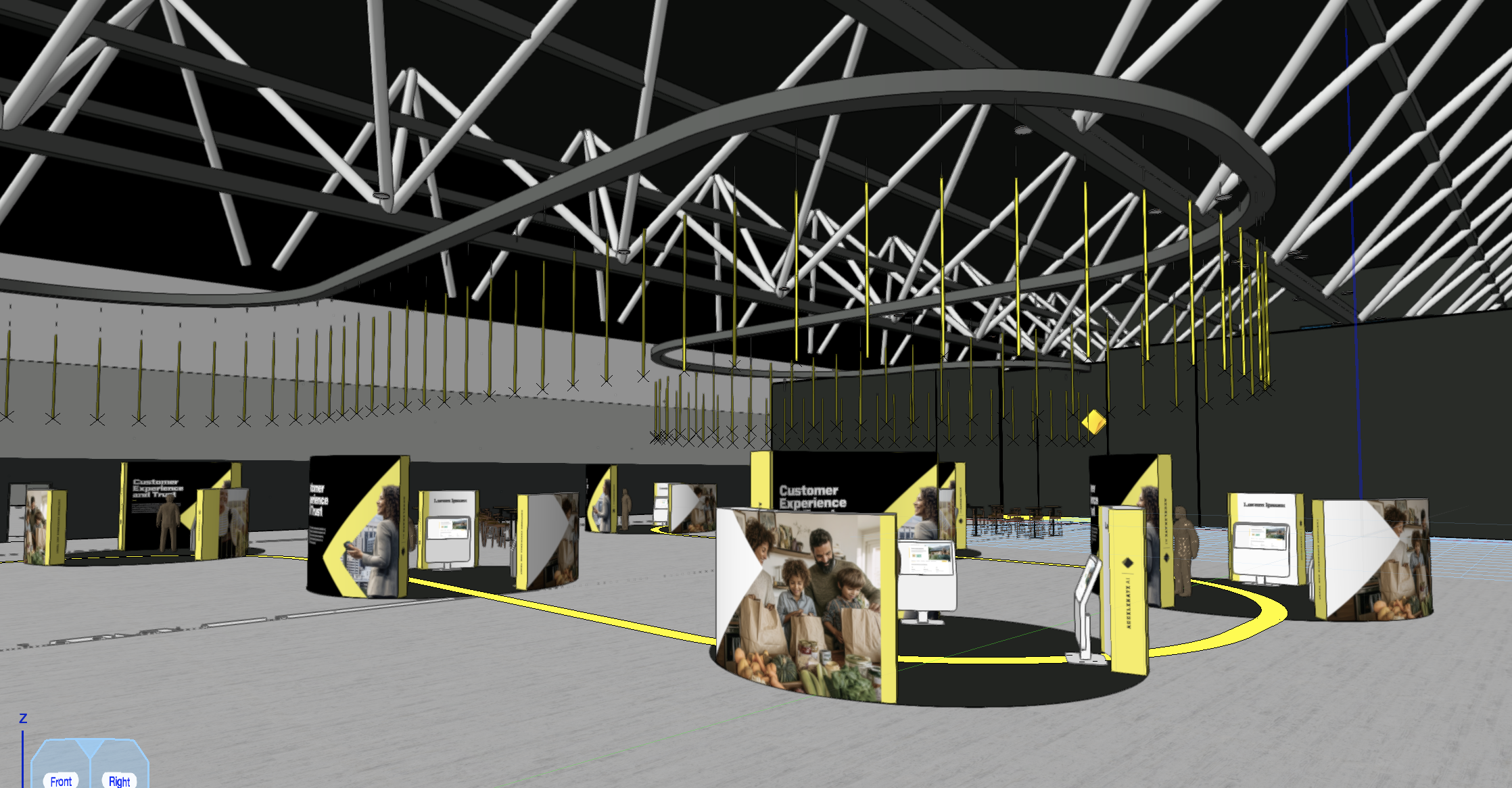 a dark and immersive exhibition space with polished concrete floors and a yellow painted line that curves through the space vertical neon rods of yellow light are suspended in the air curved photographic lightbox walls with black carpet circles with a black drapes wall in the background motion blur of small business people walking throughout the room