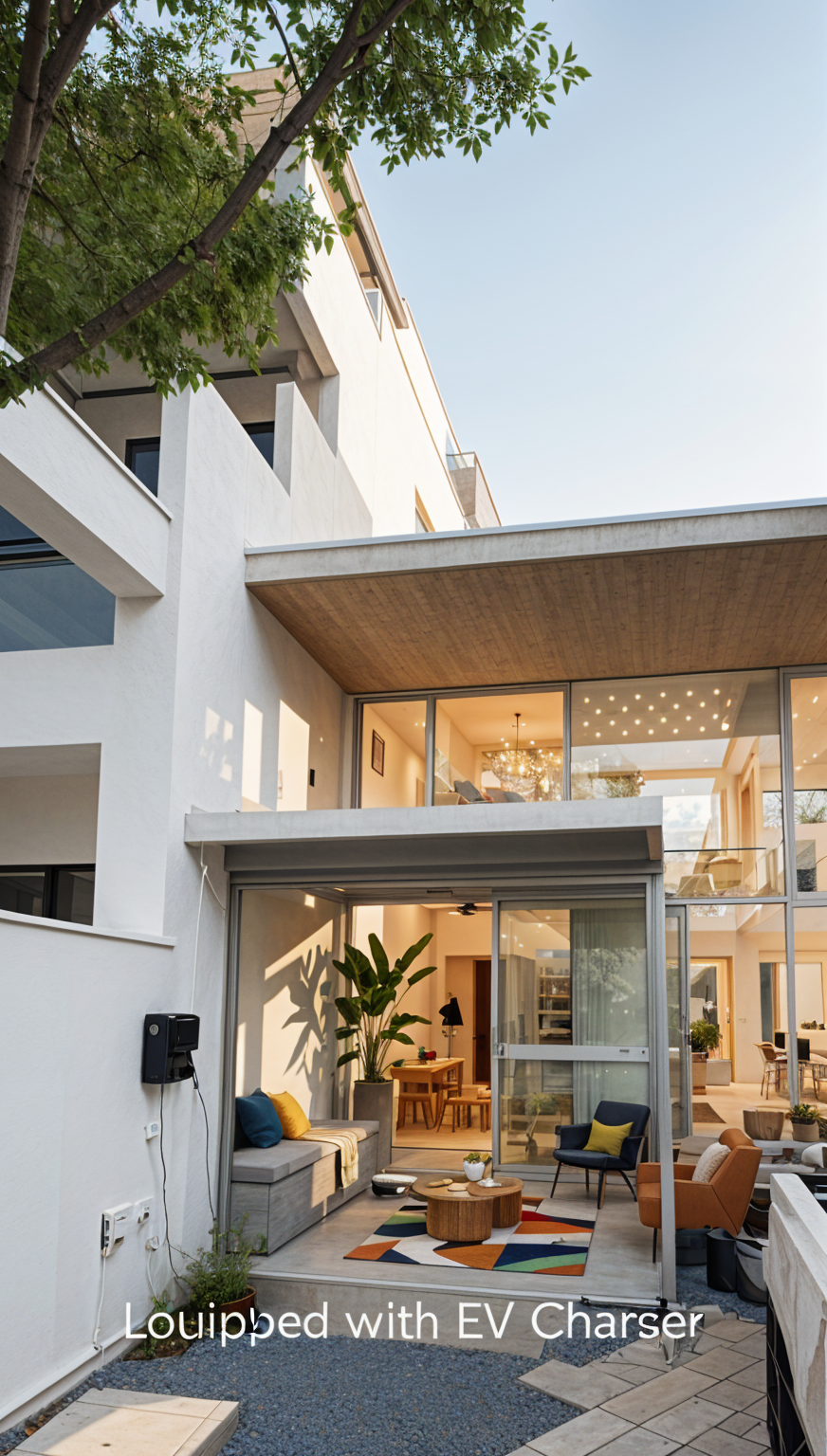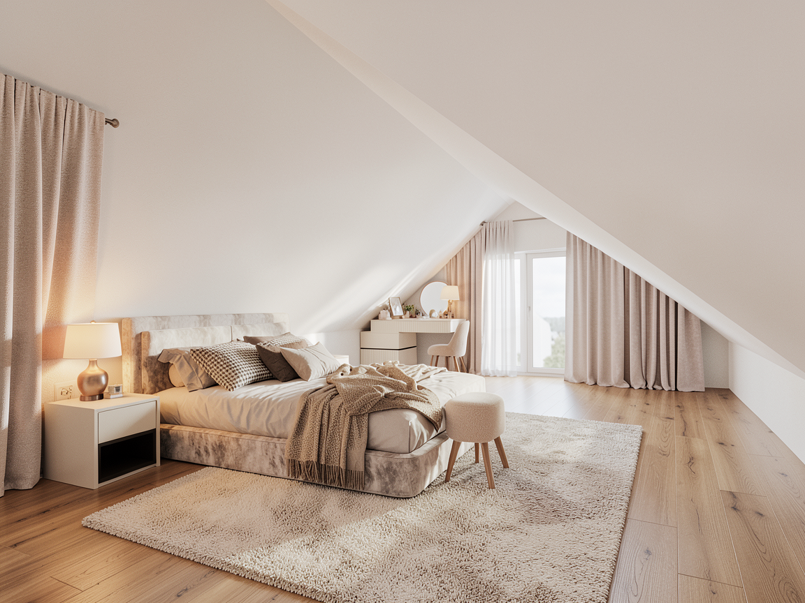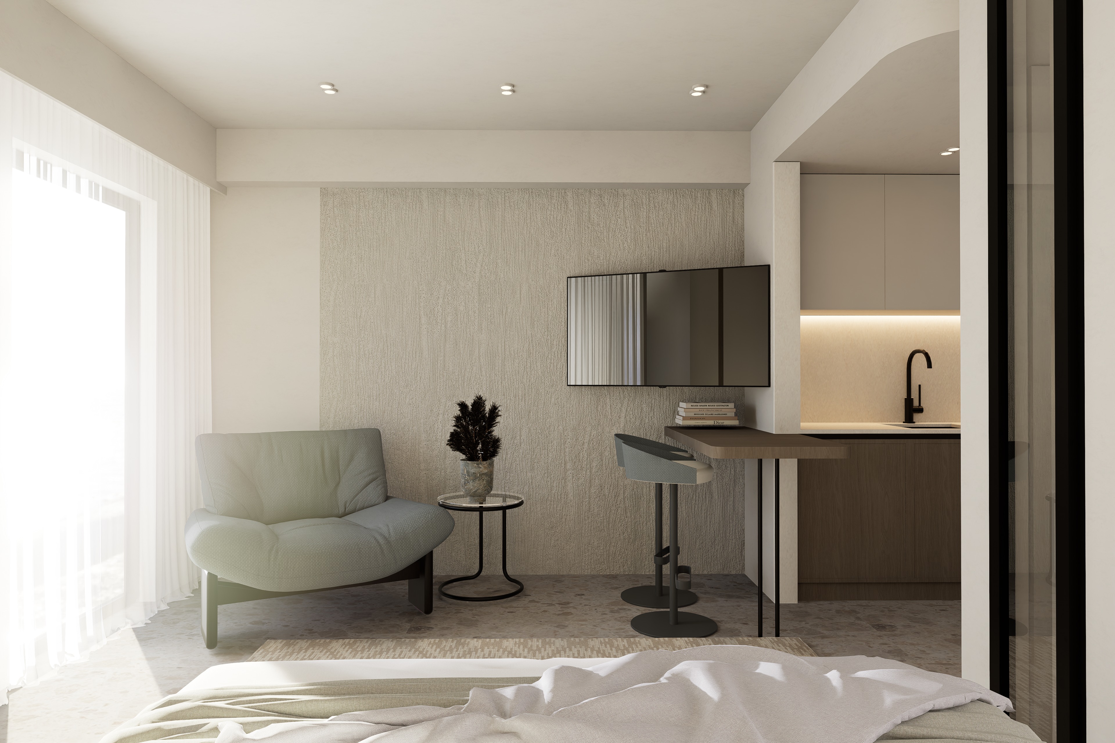 ultra realistic render of a modern bedroom corner with integrated kitchenette workspace keep the exact same camera angle framing proportions and full layout from the input image do not redesign or move anything scene foreground edge of bed with soft white neutral bedding left lounge chair with soft rounded form and textured light fabric next to chair small round side table with thin black metal base decorative plant back wall textured neutral plaster wall subtle vertical organic texture center right wall mounted tv above a floating desk console right compact kitchenette with upper cabinets warm backsplash lighting and dark faucet bar stool minimal modern stool in front of desk left side full height sheer curtains with strong daylight floor light neutral stone or terrazzo rug soft woven neutral rug partially visible materials chair soft fabric upholstery with visible weave slightly matte desk console warm wood finish matte satin kitchen cabinets matte beige finish clean flat panels backsplash warm neutral tone with soft under cabinet led glow faucet matte black wall off white textured plaster visible micro relief floor light stone terrazzo with subtle variation curtains sheer white realistic translucency lighting strong natural sunlight entering from left side window light diffused through sheer curtains soft glow natural shadows across chair desk and floor warm under cabinet lighting 3000k adding depth balanced exposure no overblown highlights realism photorealistic architectural visualization accurate reflections on tv and subtle surfaces real fabric compression on chair and bedding strong material definition wood grain plaster texture stone floor subtle imperfections for realism clean high end 4k output strict rules do not change kitchenette layout or design do not move chair table or desk do not change materials or colors do not modify lighting direction do not alter camera perspective do not add remove objects only enhance realism lighting and render quality