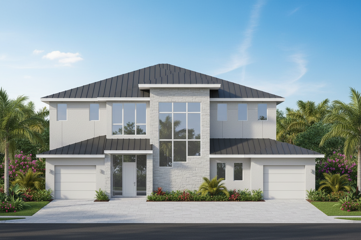 clean modern elevation dark gray 1 3 4 standing seam metal roof white fascia and soffit white window frames light gray stucco walls with thin control joints flat panel garage doors at same line as entry on each side of the home light gray stone finish white solid panel entry door with glass side lights and glass transom above yellow color to be light gray stone finish tropical landscaping large light gray paver drive and walk to entry blue sky with clouds