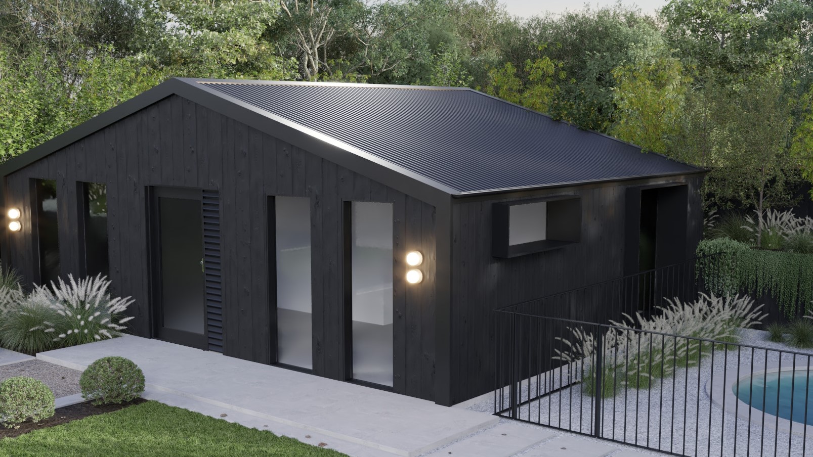 zaha hadid exterior shot please use colourbond colour manor red for all external cladding and roof please put down a cream cobblestone driveway bush setting for landscaping architecture