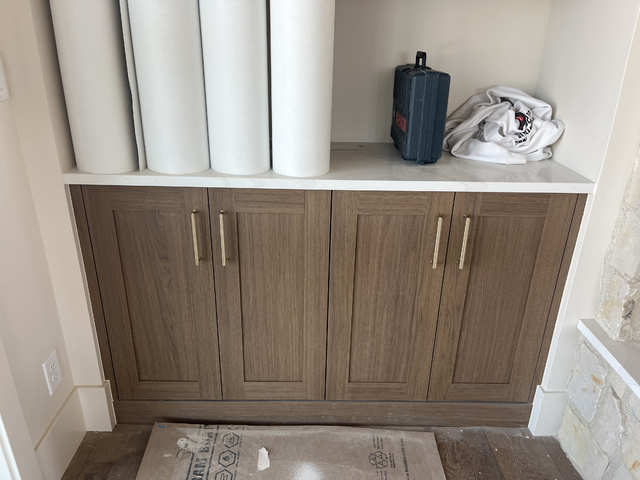 do not change the cabinets in any way preserve the exact cabinet colors materials finishes dimensions door and drawer styles hardware spacing alignment and all geometry exactly as shown do not alter the countertop shape backsplash appliances flooring lighting fixtures or wall structure only remove the construction materials clutter and mess from the scene clean the room and make it look finished and staged add a few simple tasteful home accessories appropriate for the style of the space but do not add or remove any furniture windows or architectural elements maintain the original lighting direction and realism enhance clarity and polish the photo while keeping the cabinetry and room design completely unchanged do not alter the lighting to keep the cabinet colors as they are in the image add new flooring stage the countertop for a great room