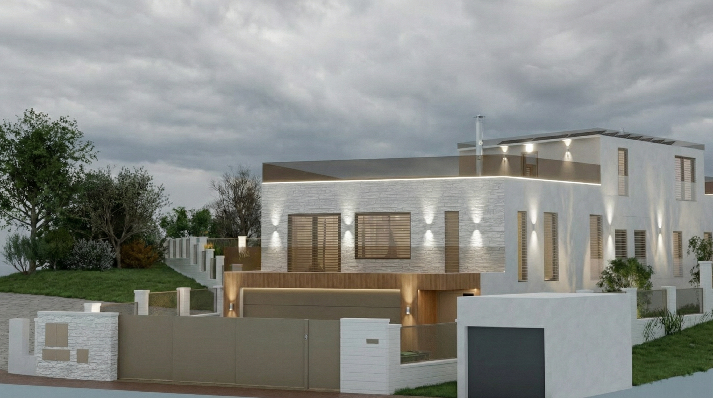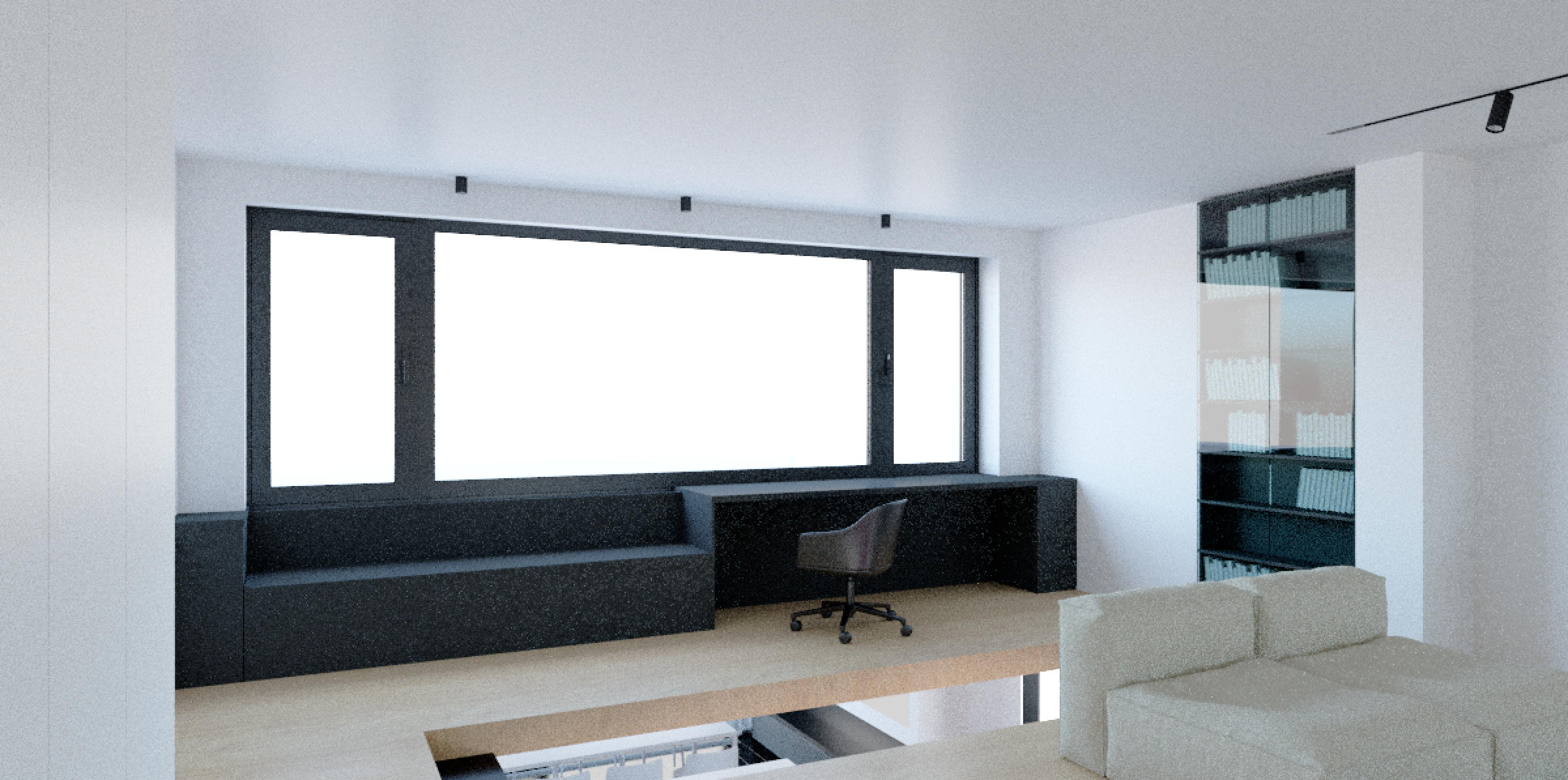modern minimalist room with large black framed windows soft natural light flooding in black bookshelves with black glass doors adorned with white books and led light inside dark gray furniture including a sleek black chair walls painted in white creating a clean and airy ambiance light wooden flooring adds warmth atmosphere serene and contemporary the highlighted elements in blue are glass railings for the stairs outside the window in the distance there is greenery and trees