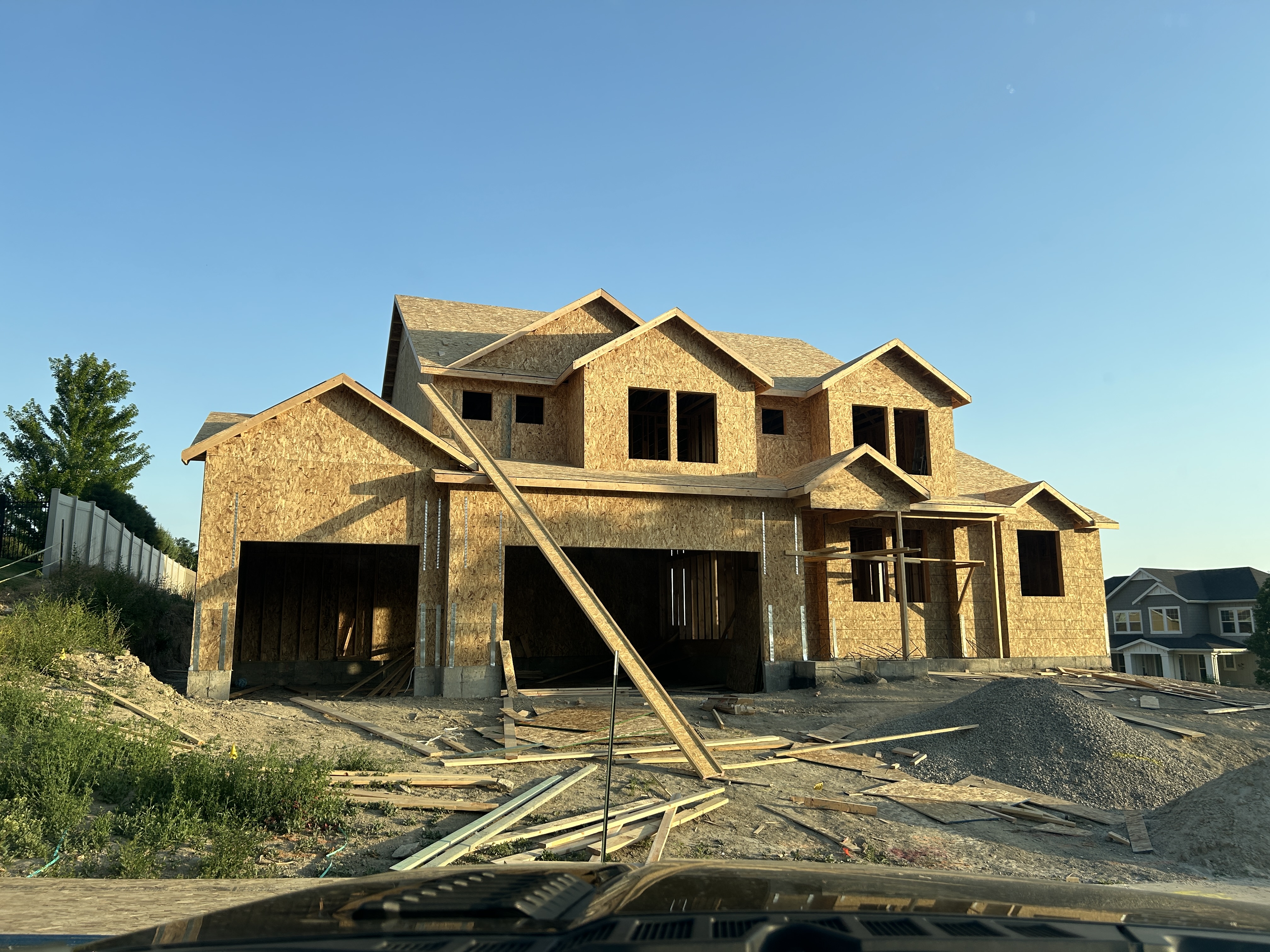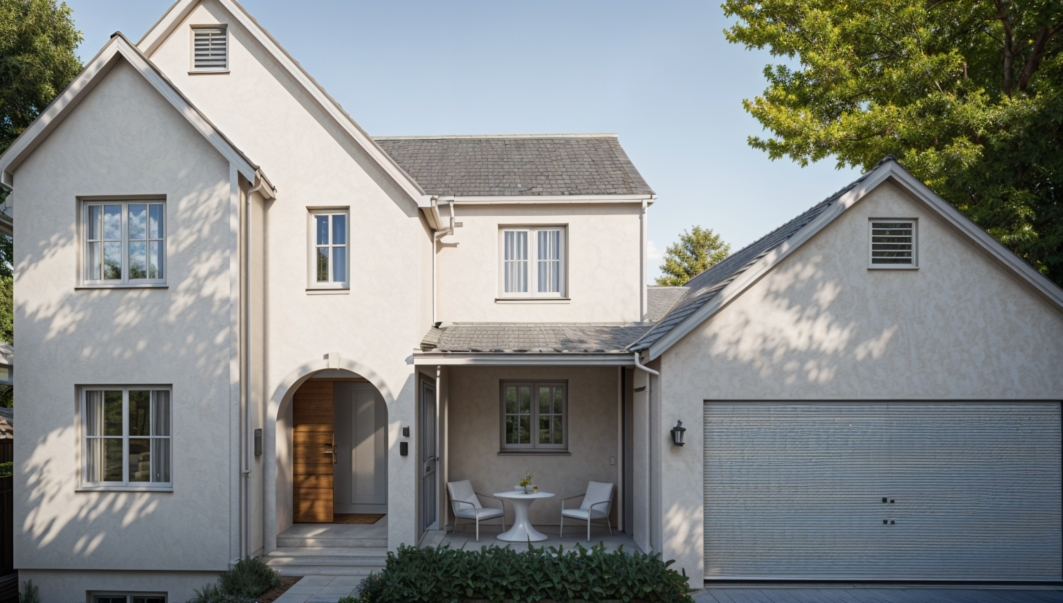 tudor revival exterior shot white beige and black house stone exterior with a driveway and nice landscaping architecture