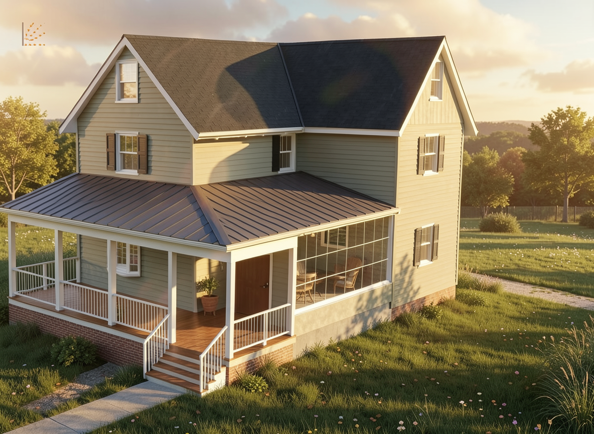 add windows on left side of top floor to make sure the each side of the building is identical replace landscaping background with a cedar edge the water bank level should be lower than the land with an embankent dropping by about 15 feet there should be a dock alomgside the river bank