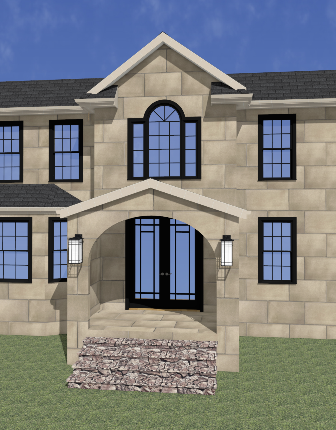 add a path to the stairs coming from the left show fire in the two lanterns by the arch