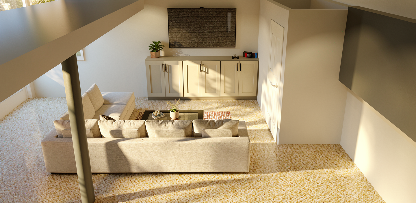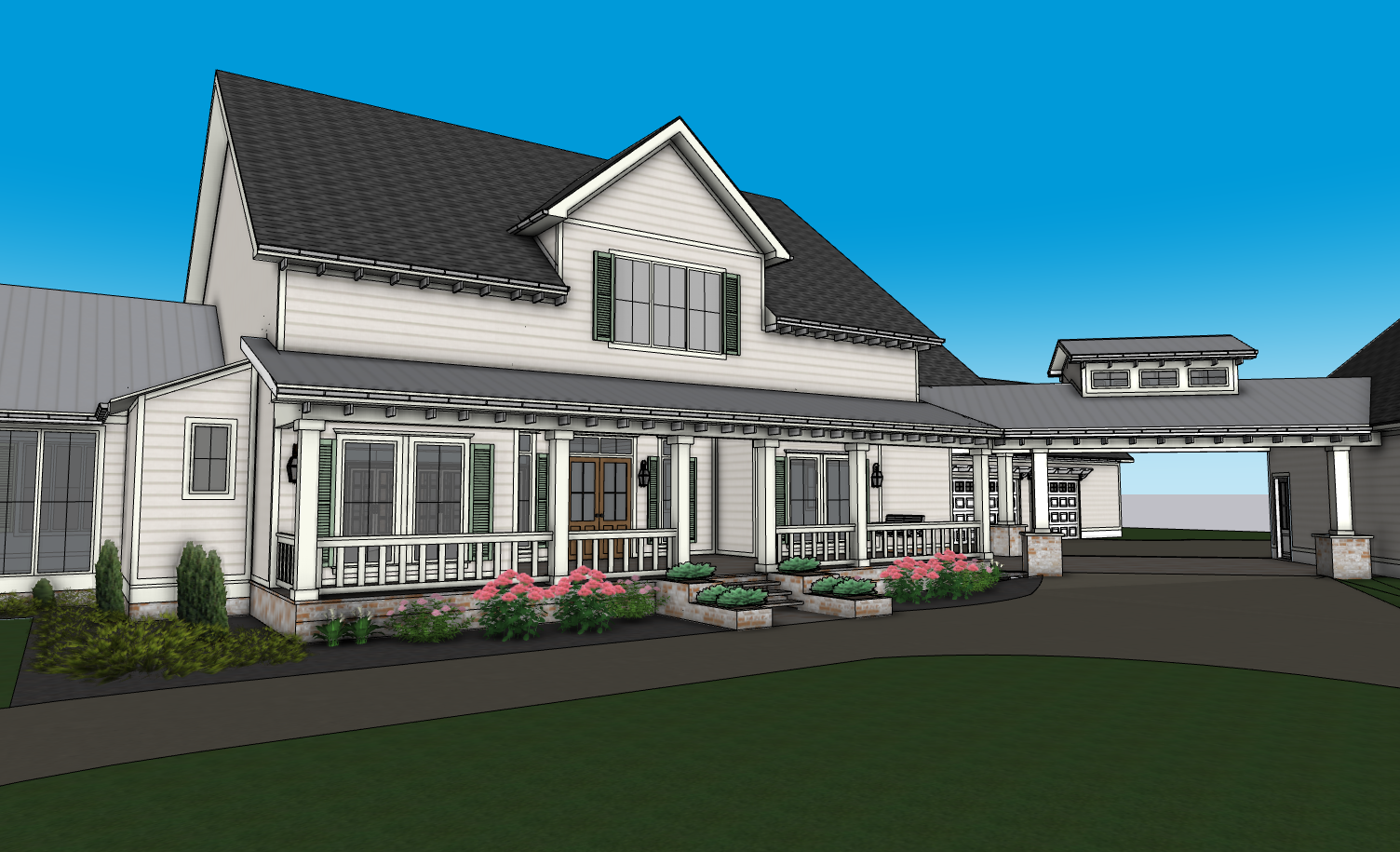 create a beautifully rendered image of a classic farmhouse with a welcoming porch the house has white wooden siding deep gray gabled roof and subtle olive green window shutters the front porch features delicate white railings and is adorned with vibrant pink flowers and lush green bushes the driveway is a smooth charcoal gray complementing the serene expansive green lawn the background should have a clear bright blue sky creating a peaceful and inviting atmosphere