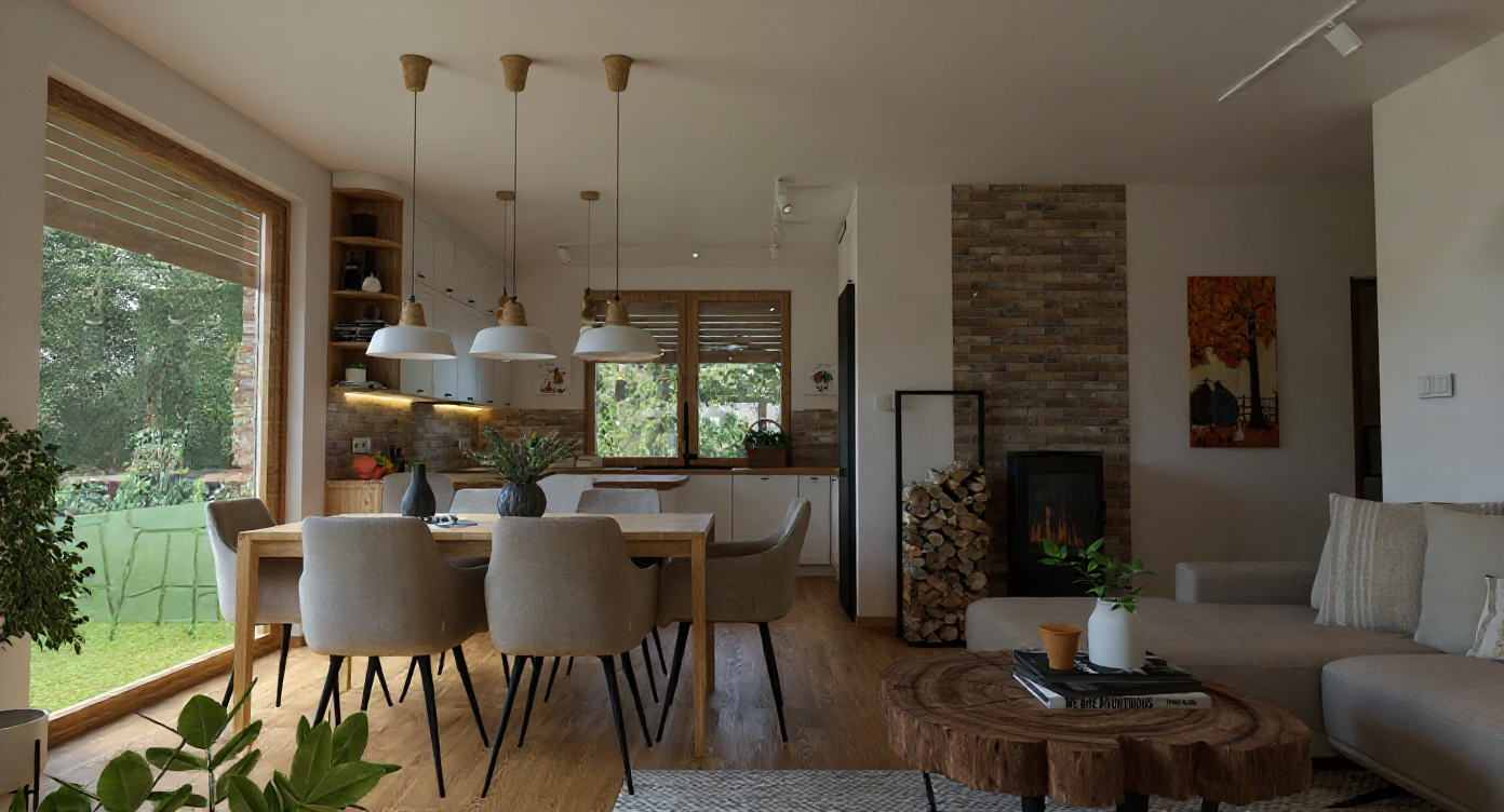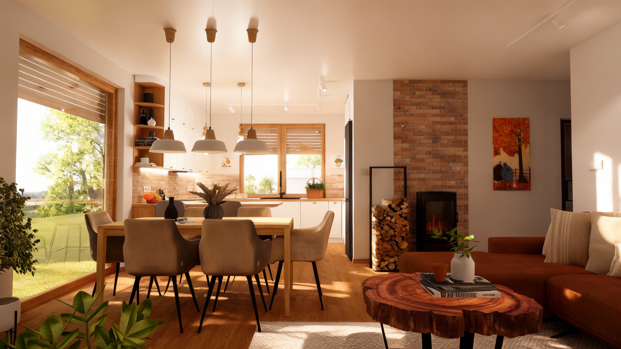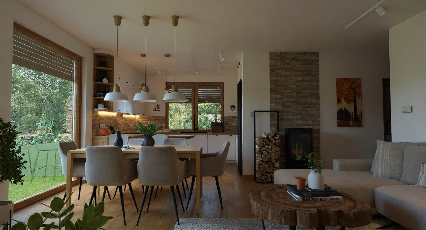 transform this picture into a realistic interior visualization with natural light keep the camera angle keep the original materials and textures make it an ultradetailed view with global illumination and photo based rendering materials change view begind window on garder add sunlight and contrast