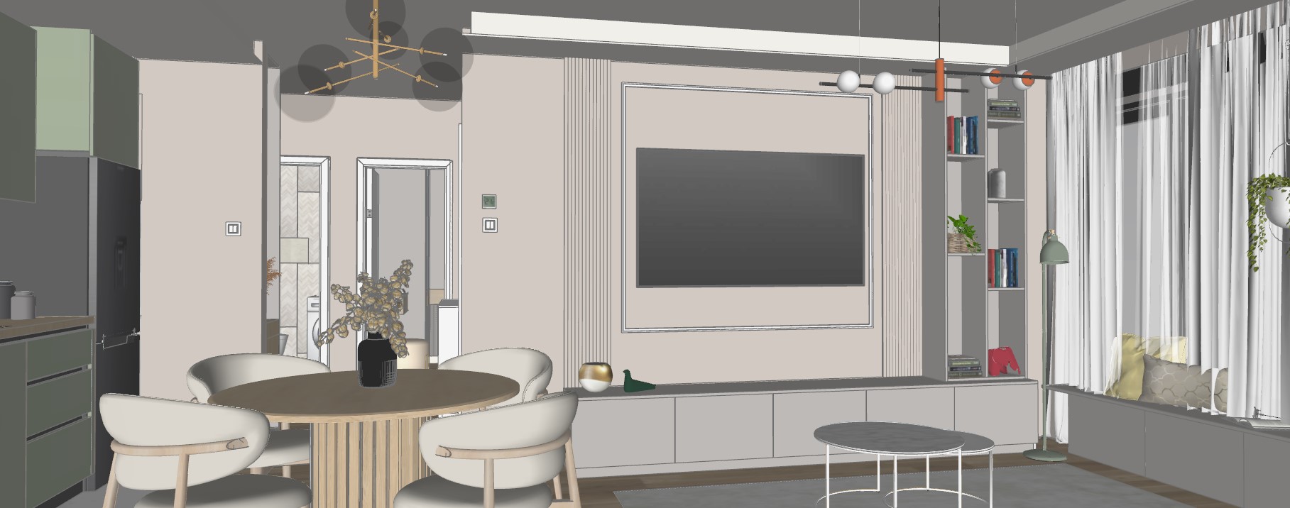 everything is light and cozy walls are beige sand color and furniture is cashmere light oak and green kitchen