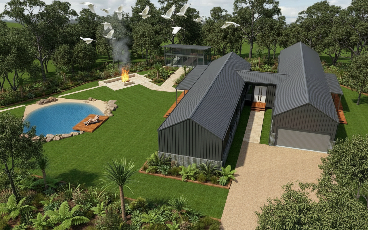 design ultra modern barn style house from two pavilions 6 meters wide and 30 meters long with a solid joining link