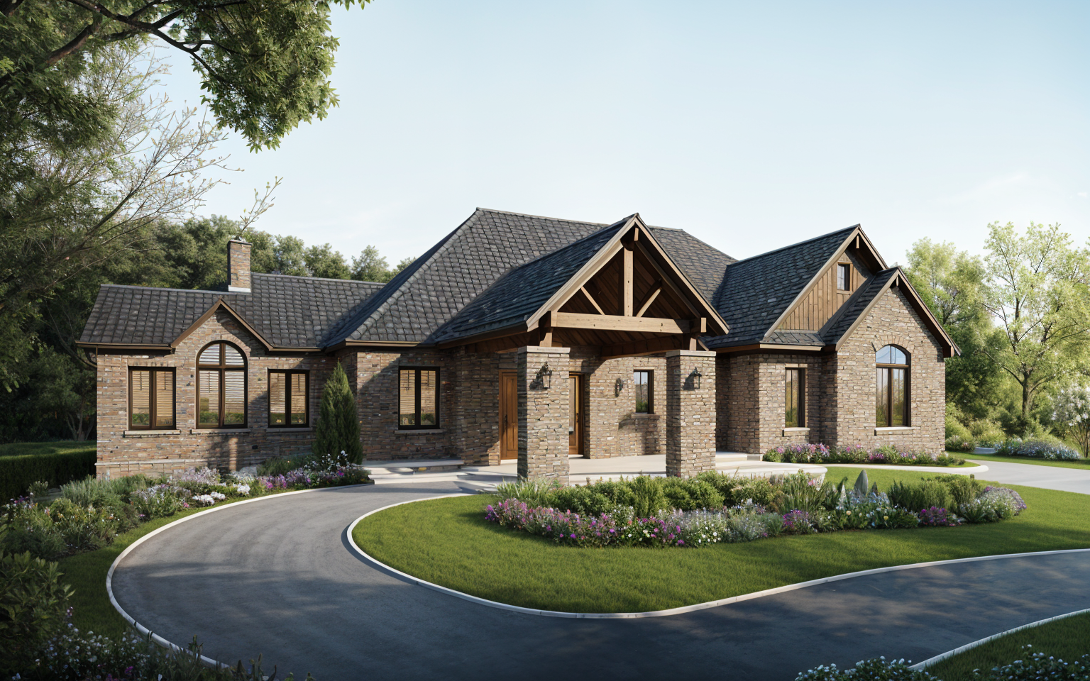 make the paint color a monochromatic light beige located in a grassy field with forest in the back forty the lawn around the house is mowed make this look realistic this is a picture of the north side of the house so make the shadows more accurate