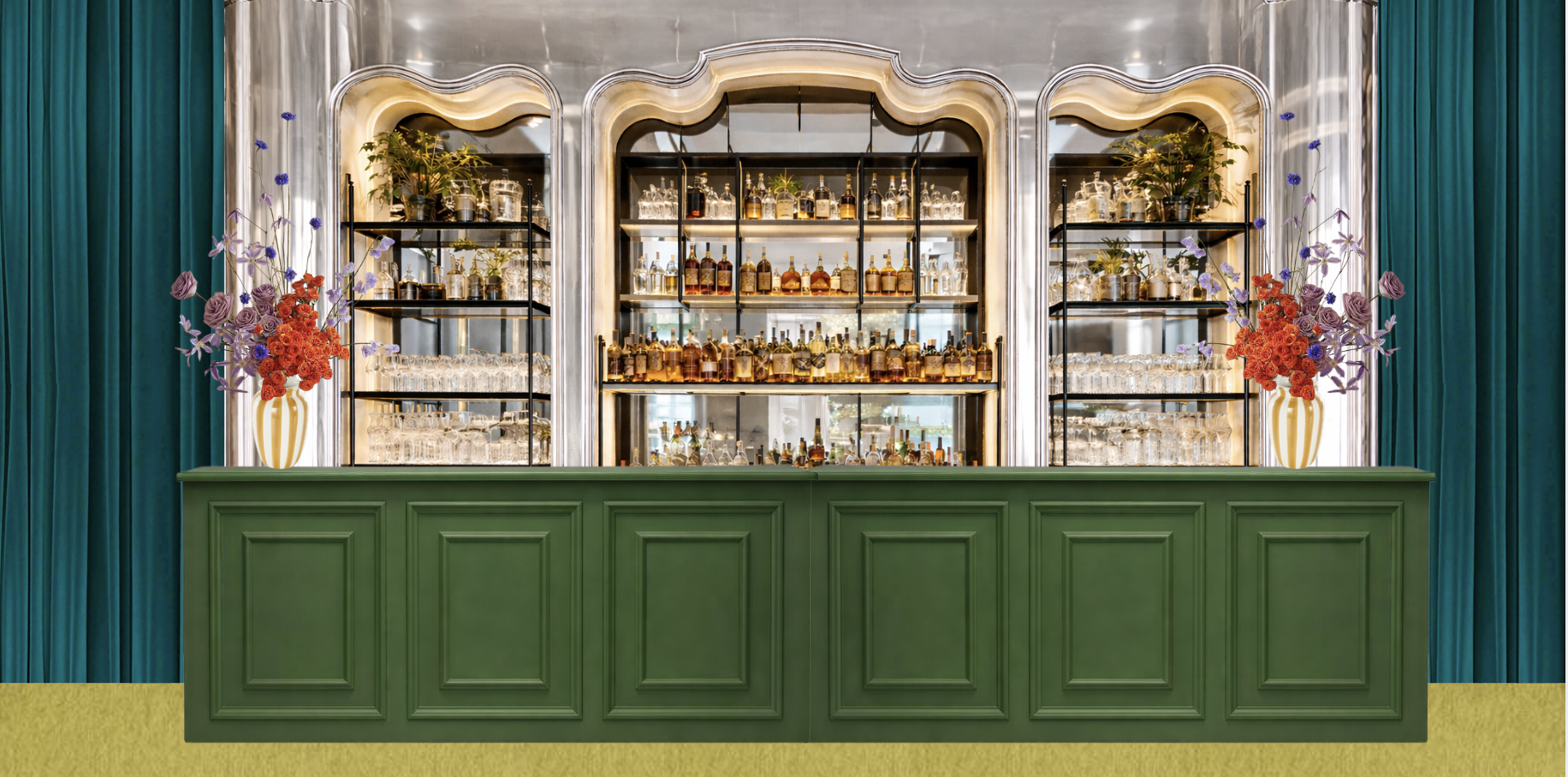 evening after party lighting green painted bar front chrome votive candles on the shelves mixed with clear glassware the shelving unit is chrome have the shelves lit on the inside walls are teal velvet drape floor is yellow carpet