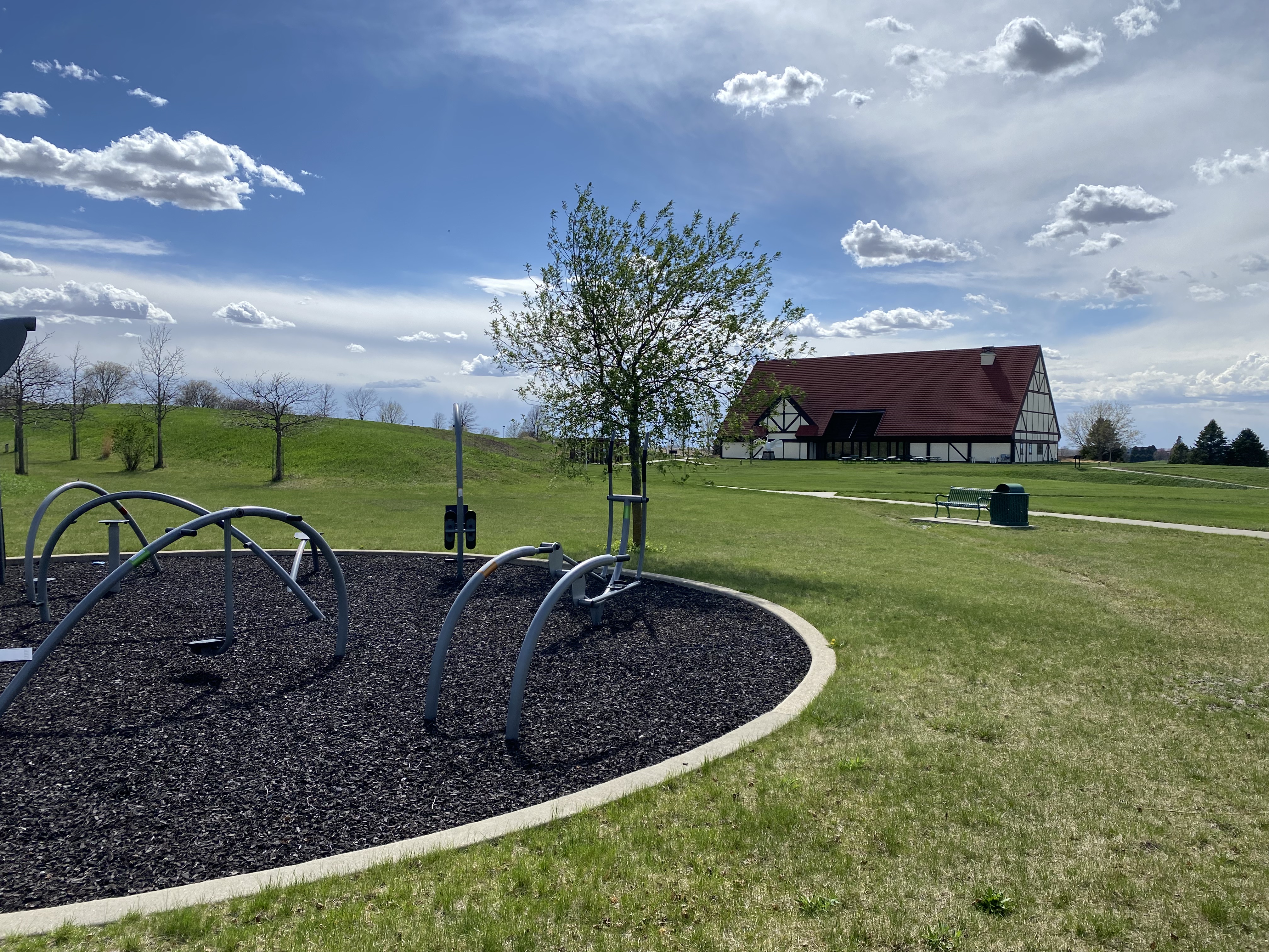 show a viking ship theme danish monstrum playground show leaves on trees show leaves all all trees add lots of children remove bench and trash can change groundplane under playground to red and white rubber surface show parents sitting watching kids play in modern benches