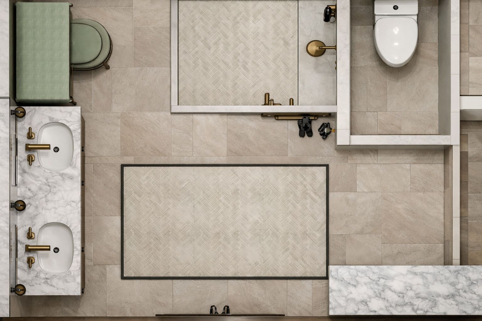 photorealistic enhancement prompt top down interior render goal convert the provided top down bathroom 3d render into an ultra photorealistic architectural interior visualization while preserving the exact layout and proportions lighting and shadows simulate soft natural daylight entering the bathroom from nearby windows creating realistic light falloff and soft shadows across the floor tiles and fixtures introduce global illumination and subtle light bounce off the marble and tile surfaces add soft ambient occlusion in corners under vanities around plumbing fixtures and along tile edges enhance warm reflections on brass fixtures and hardware ensure shadows remain soft and realistic for a luxury interior photography look textures and materials upgrade all materials to high resolution photorealistic textures enhance marble countertop surfaces with realistic veins and subtle surface gloss improve ceramic sink and toilet surfaces with natural reflections add fine grout lines and slight variations in the floor tiles add micro details such as fabric weave on the bench cushion and rug fibers adjust roughness and bump maps to improve light interaction color and contrast refine the color grading to achieve a high end interior design magazine aesthetic maintain a neutral luxury palette of warm stone marble whites and brass accents slightly increase contrast to emphasize material separation balance highlights so marble and ceramics appear clean but not overexposed fixtures and furniture realism ensure fixtures feel realistic and grounded add subtle reflections on faucets shower hardware and brass finishes introduce very minor imperfections to prevent the scene from looking overly computer generated ensure all objects maintain correct scale and alignment surface detail add realistic surface behavior subtle scuffs on tiles slight fabric wrinkles on the bench cushion faint grout shading between tiles very light wear on frequently touched surfaces these should remain extremely subtle and high end accessories and styling add small lifestyle elements while keeping the architectural layout visible examples neatly folded towels small plant or greenery soap dispensers decorative tray on the vanity minimal bathroom accessories keep styling minimal and sophisticated camera and composition maintain the top down orthographic architectural perspective preserve the exact layout and spatial relationships keep vertical alignment and proportions accurate post processing apply professional photographic finishing subtle depth clarity enhancement slight vignette micro lens realism remove render artifacts sharpen fine details desired output style the final image should resemble luxury architectural visualization high end real estate marketing photography editorial interior photography ultra realistic textures lighting and materials