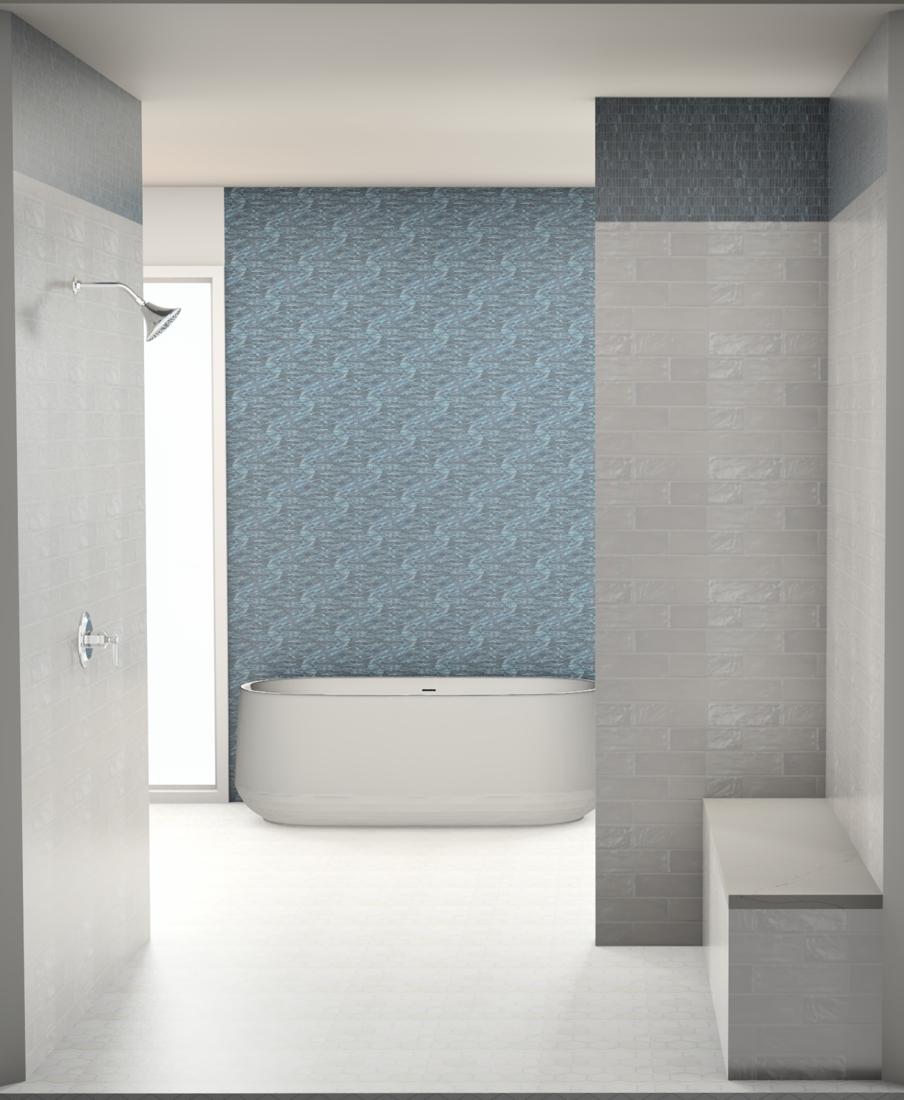 render a modern bathroom with a serene atmosphere design features include a luxurious oval bathtub in soft cream centrally placed against a wall with intricate blue wave patterned tiles evoking a sense of tranquility the surrounding walls are adorned with sleek light gray tiles adding elegance incorporate a minimalist shower head and tap in polished chrome on the left wall the ceiling is a calming off white complementing the smooth white flooring ambient lighting casts a gentle glow enhancing the peaceful ambiance and highlighting the textures and colors throughout the space
