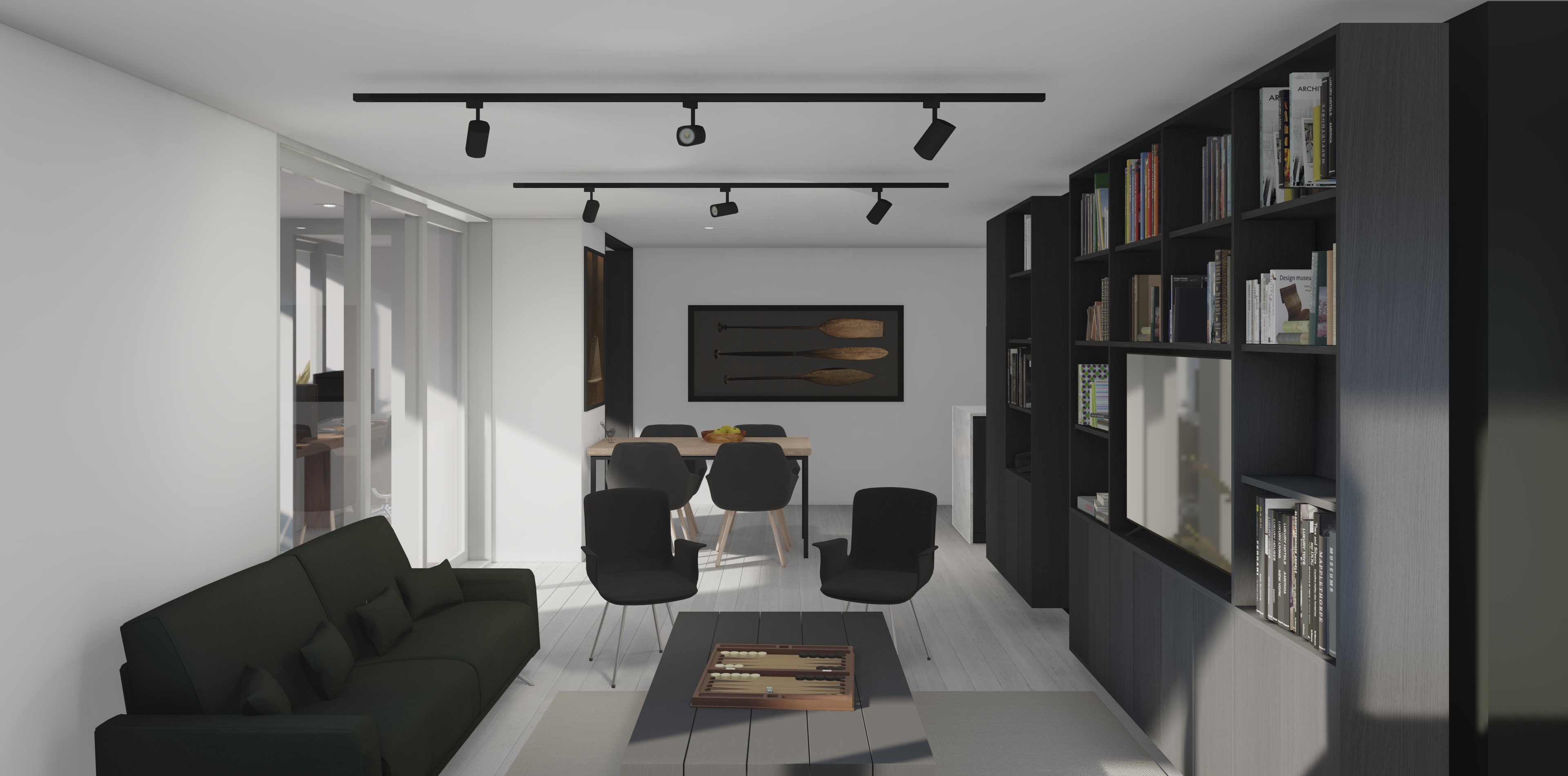render objective maintain existing geometry layout and proportions maintain spatial configuration improve lighting quality and create a refined scandinavian atmosphere architectural photography style strict constraints do not modify geometry do not change walls floors ceilings openings or dimensions keep all furniture in the same position only replace the specified furniture elements do not alter camera angle 1 furniture replacement keep same location left side armchair remove the existing black armchair replace it with a brown leather armchair keep same position and scale coffee table remove the existing coffee table replace with a coffee table with light wood legs and a glass top maintain original placement and proportions add a cowhide rug underneath the coffee table ensure realistic scale and natural placement 2 wall decor remove large framed artworks replace with smaller casual scandinavian style framed artworks keep composition balanced and minimal 3 windows left side change window frames to black keep window size and position unchanged lighting and color enhance natural daylight soft diffused scandinavian lighting neutral white balance avoid yellow color cast bright clean well balanced exposure camera and perspective correct vertical lines ensure perfectly straight verticals apply architectural photography lens correction