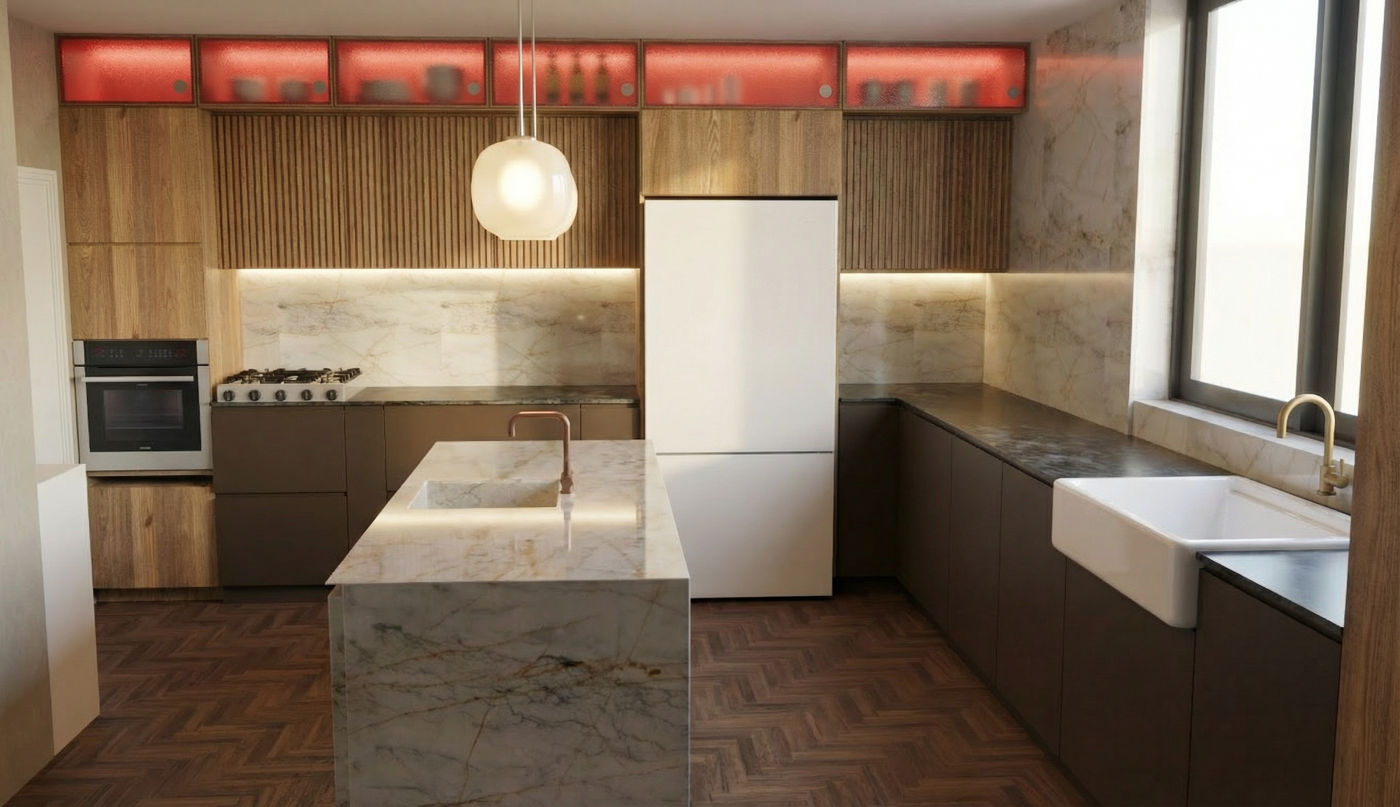 render a hyper realistic modern high end contemporary three story house in florida setting where there are palm trees maintain the window design where there are shutter design on left and right side the garage door is a sleek modern design in matte gray with wide horizontal panels and narrow glass inserts that create a clean contemporary look while letting in controlled natural light the roof is gray metal roof featuring a mix of gray brick white stone featuring large windows the exterior features a horizontal walnut wood panels on the center where the 3 windows are located the finishing around the garage doors are light gray bricks the entrance includes a square arched in dark gray wood finish the main door is 6 feet wide made of frosted glass with 4 horizontal mulls the trellis are all in walnut brown the walls are a soft white with a smooth finish creating a serene and inviting atmosphere with lots of greeneries and landscape and with dramatic sky