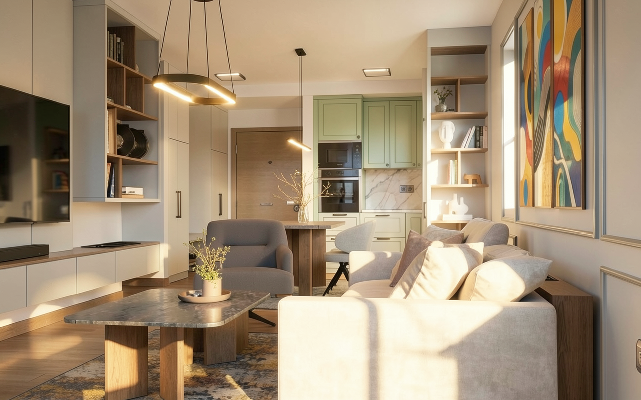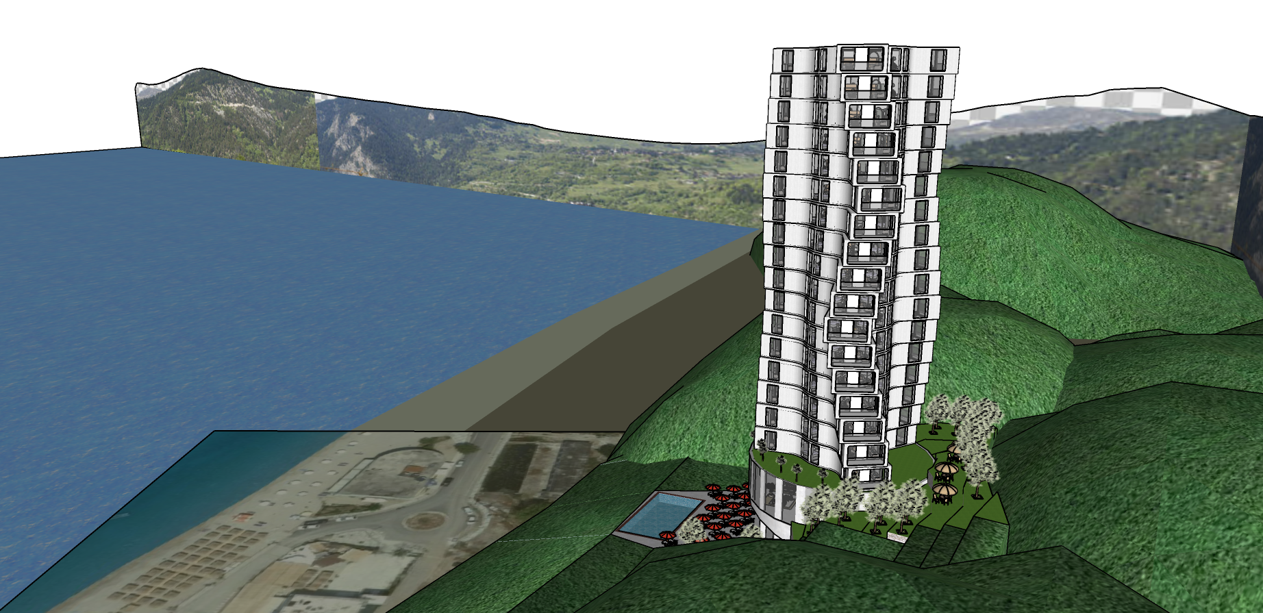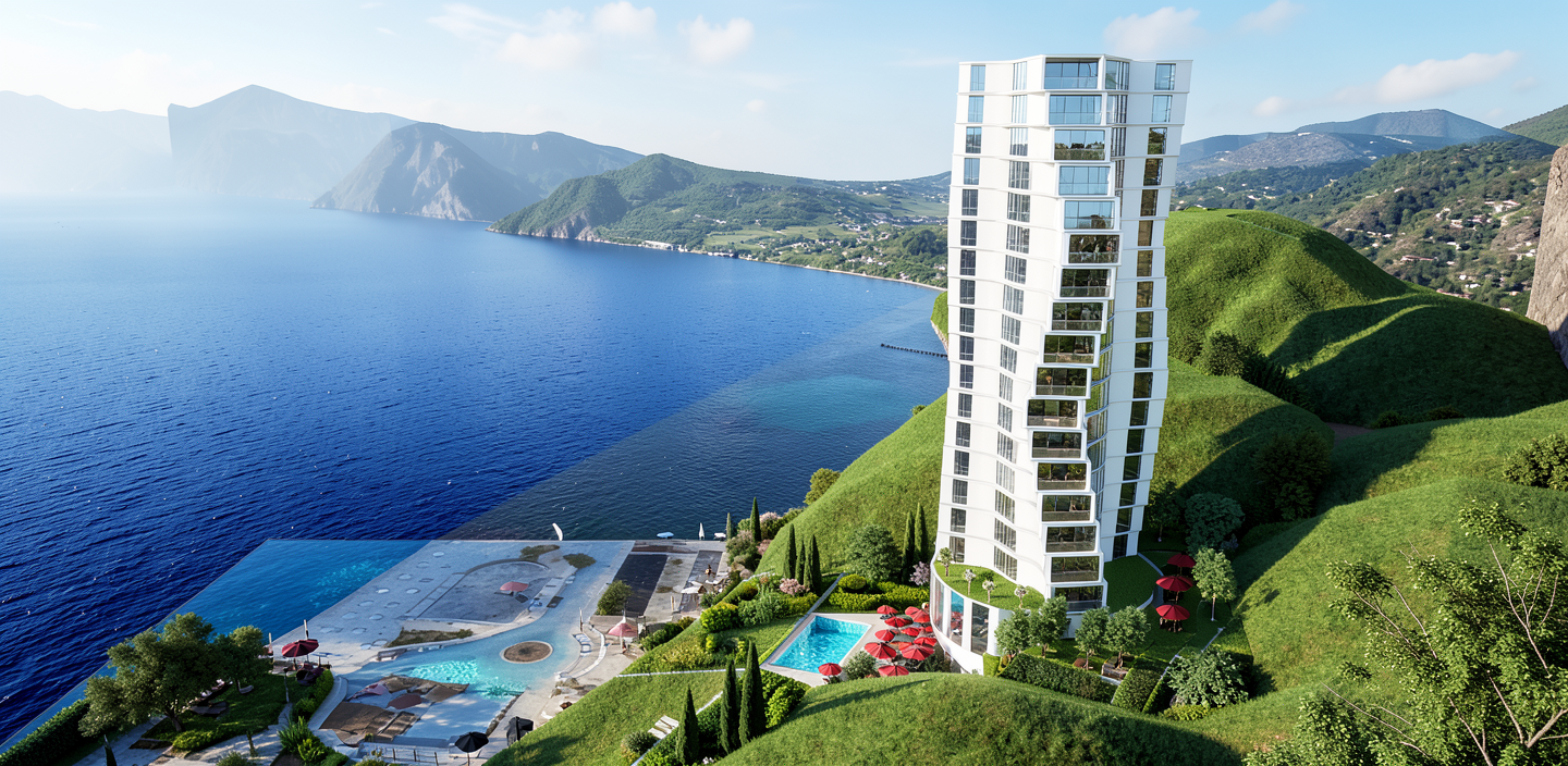 a serene coastal scene featuring a modern high rise building on a lush hillside the tall building stands prominently with sleek white and gray exteriors verdant green hills surround the structure adding a natural backdrop a vast blue ocean stretches out beside the hills meeting a clear sky at the horizon incorporate vibrant red umbrellas around a small inviting blue swimming pool near the building the atmosphere is peaceful and calming capturing the beauty of a coastal landscape on a sunny day put some modern villas and low buildings around the hills