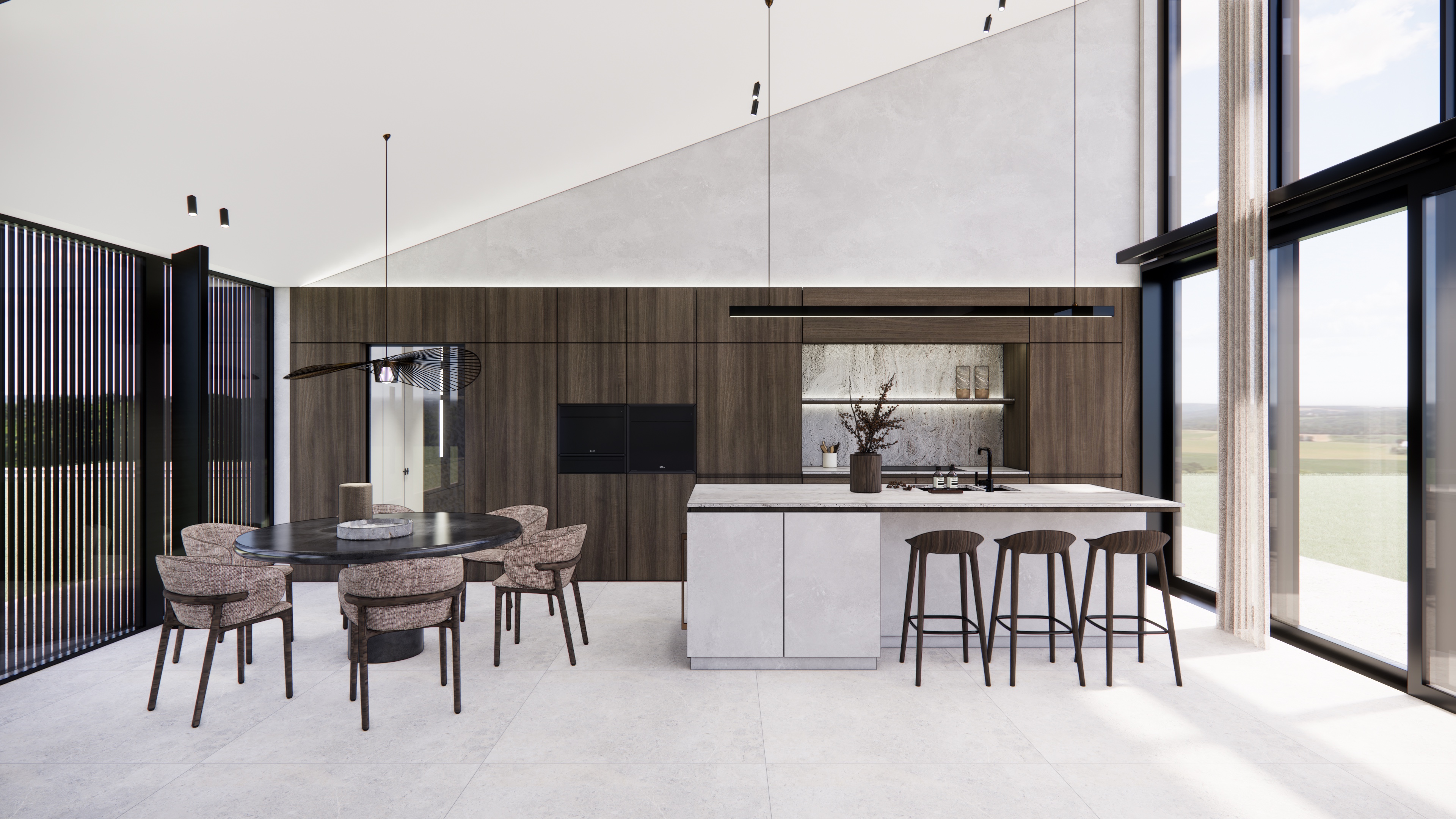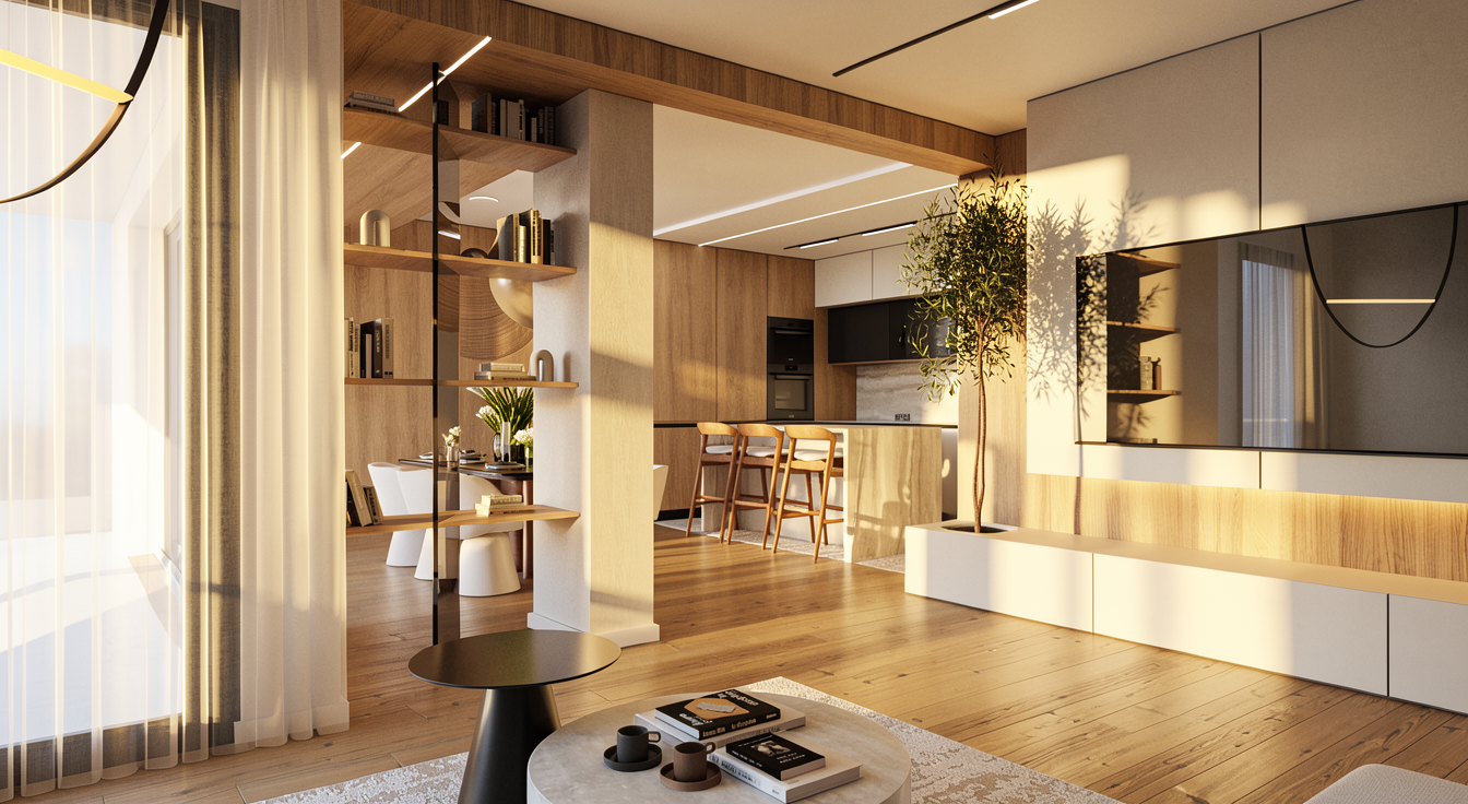 ultra photorealistic architectural interior render preserve exact camera angle composition scale and layout improve lighting material realism and depth only high end contemporary interior soft natural daylight mixed with warm artificial lighting accurate materials refined textures no exaggeration editorial quality calm and elegant atmosphere