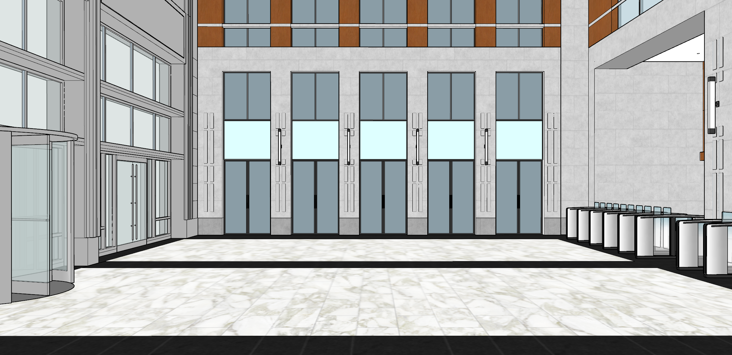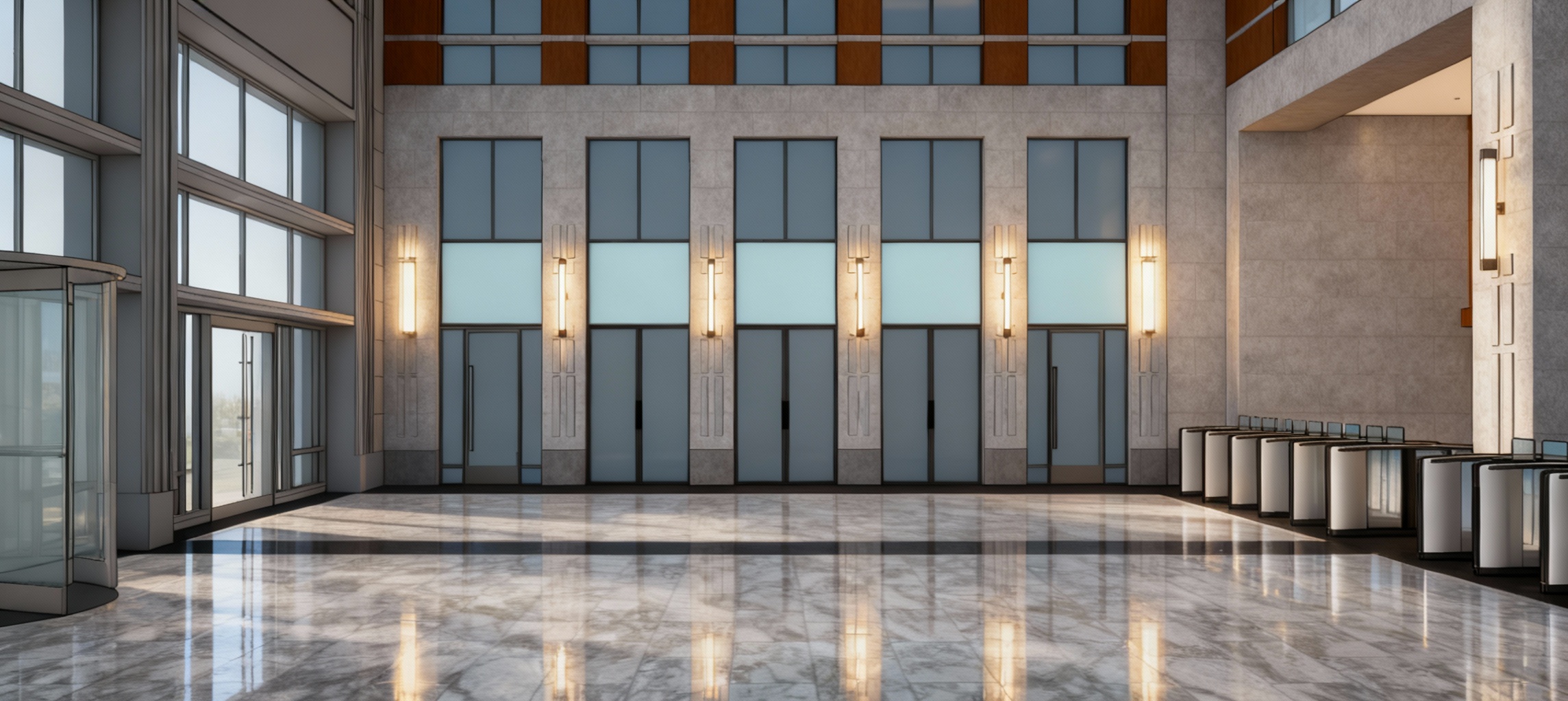render a grand atrium lobby filled with abundant natural sunlight streaming through large glass openings all interior sconces should be lit adding warm ambient glow the flooring should feature a striking contrast between glossy white calacatta marble and black nero marquina tile laid in a refined pattern centered along the main wall open all the double black framed glass doors opening into a modern lively chic caf with black awning canopies above each doorway the caf visually connects to the lobby and includes elegant high end furniture populate the scene with upscale people naturally flowing between the caf and lobby some sitting conversing or carrying coffee in the right side of the lobby show people passing through sleek security turnstiles use bright daylight illumination mixed with soft artificial light from the sconces for a balanced luxurious atmosphere