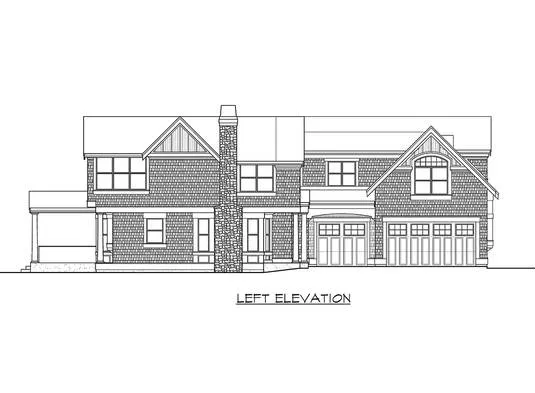 this is the left side view of the home no front entrance dark grey horizontal siding black window trim brown wood brown garage doors the right portion of the house is the garage and needs to have the appearance of being set back far back from the middle of the house maybe 30 feet as it were an l shape house the far left is a covered porch