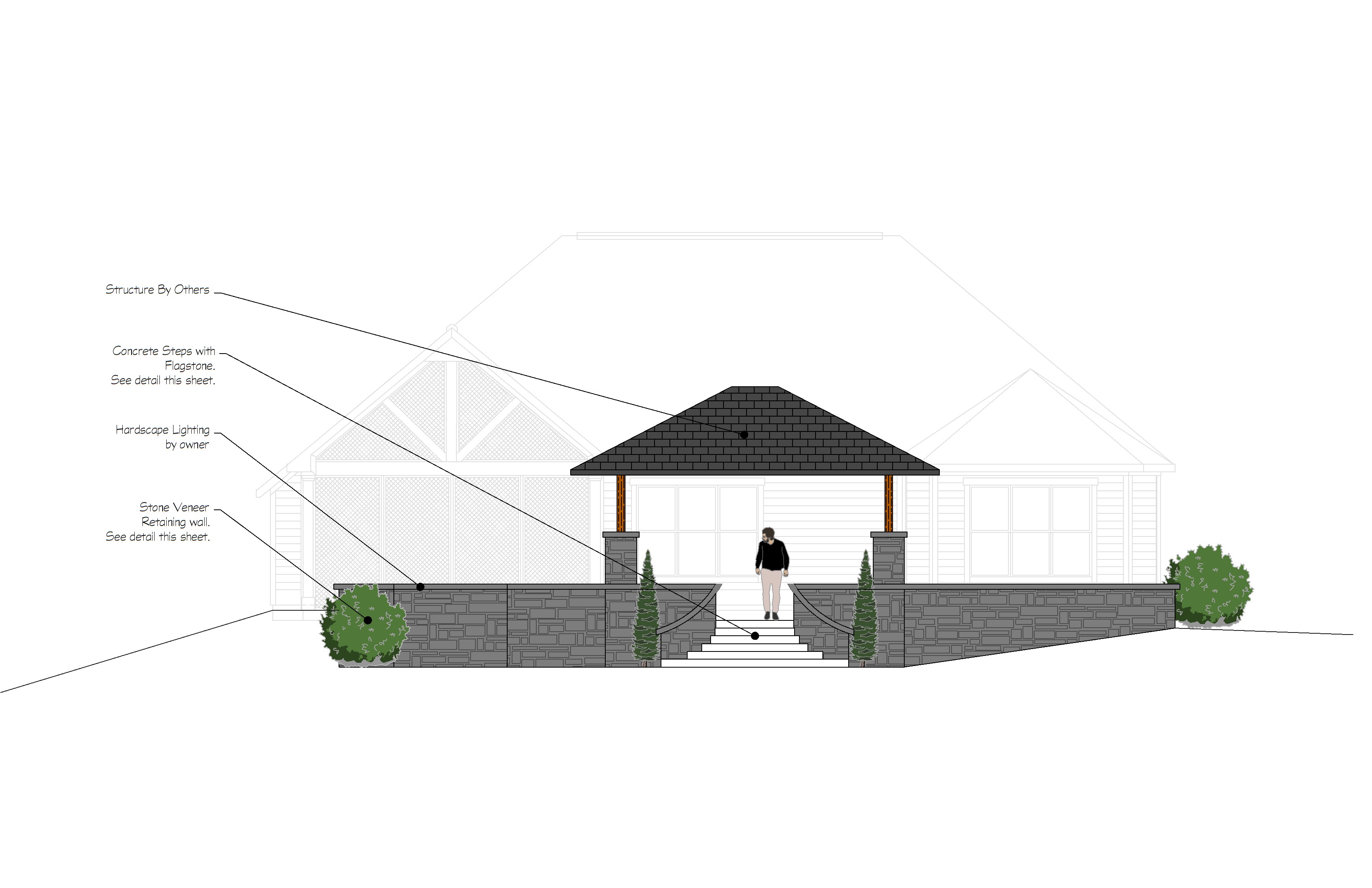 create a rendering of this elevation of a residential home with a seat wall and stairs in a wooded setting