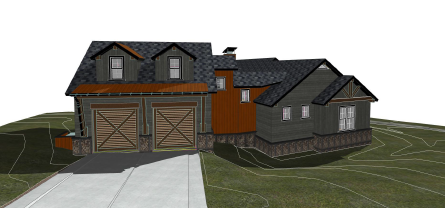show me this exact render4ing but switching beam work to a solid black stain and the gray green siding as a stained cedar in mid darker tone walnut brown color black shingles the orange showing is a rusty corregated metal on that portion of siding and roof over the garage