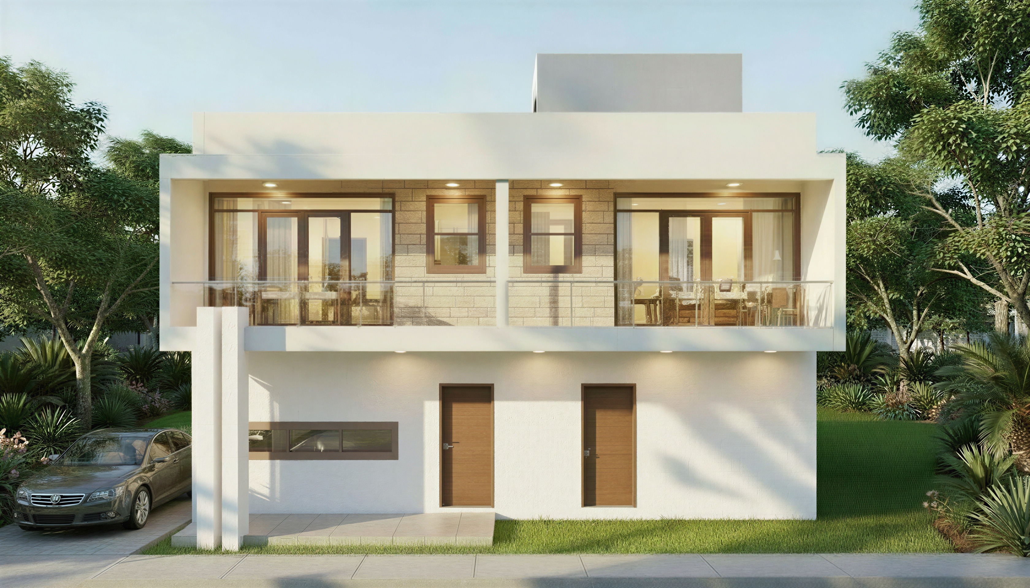 add 4 potted plants and furniture on balconies