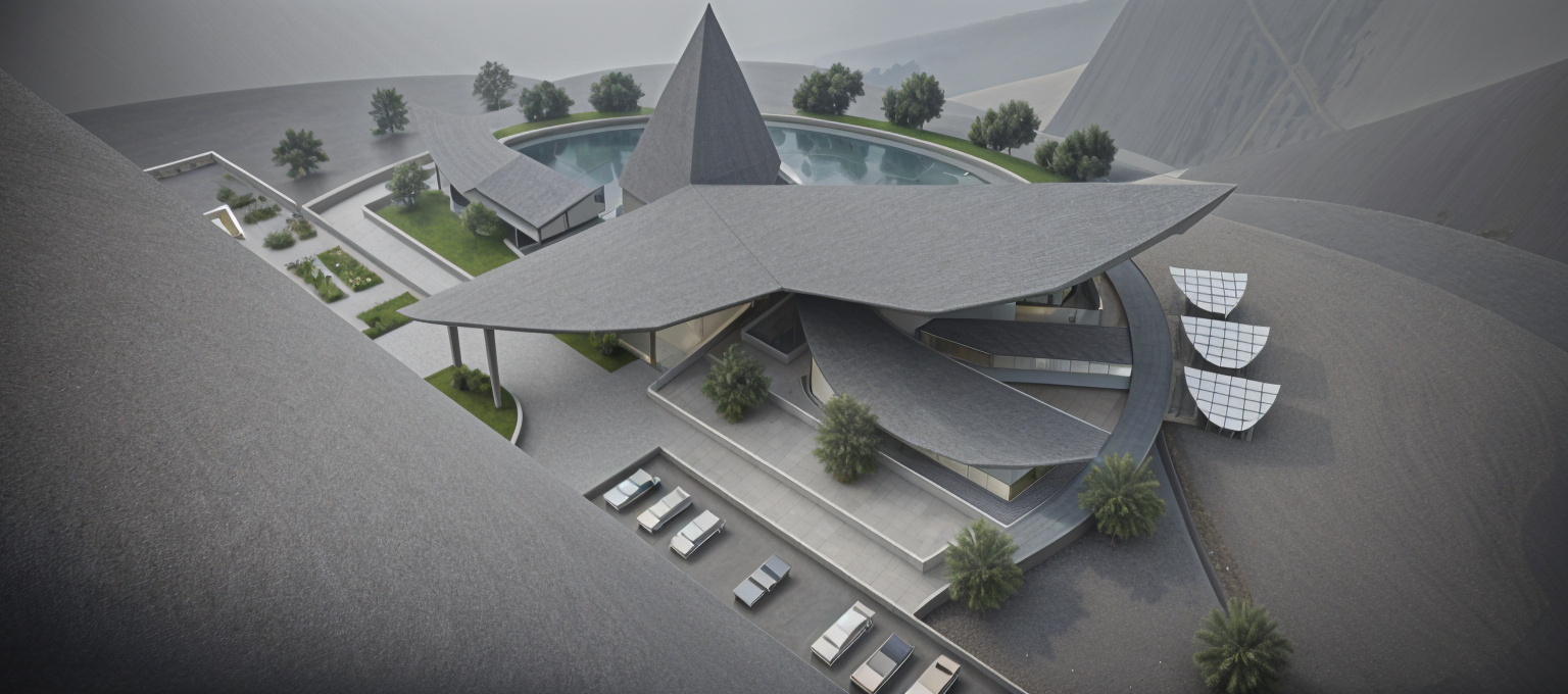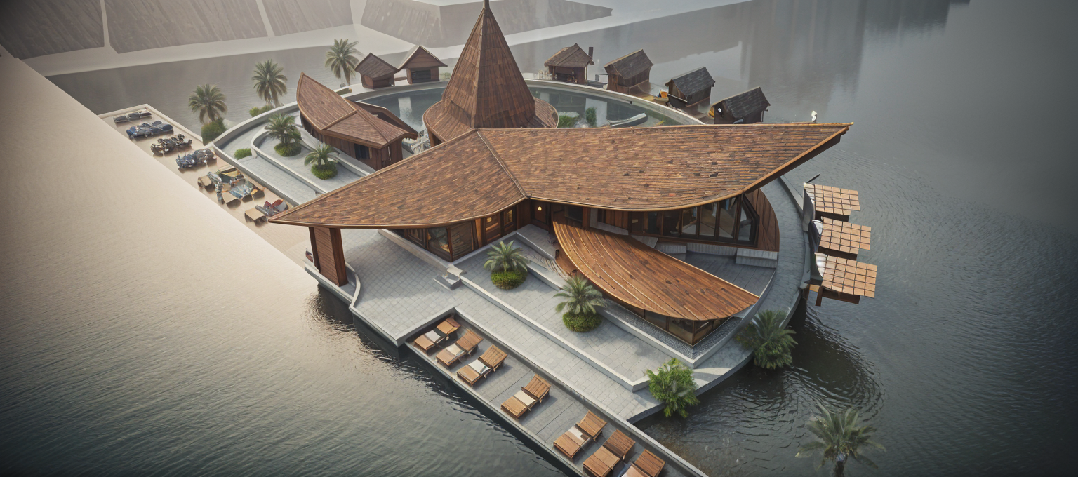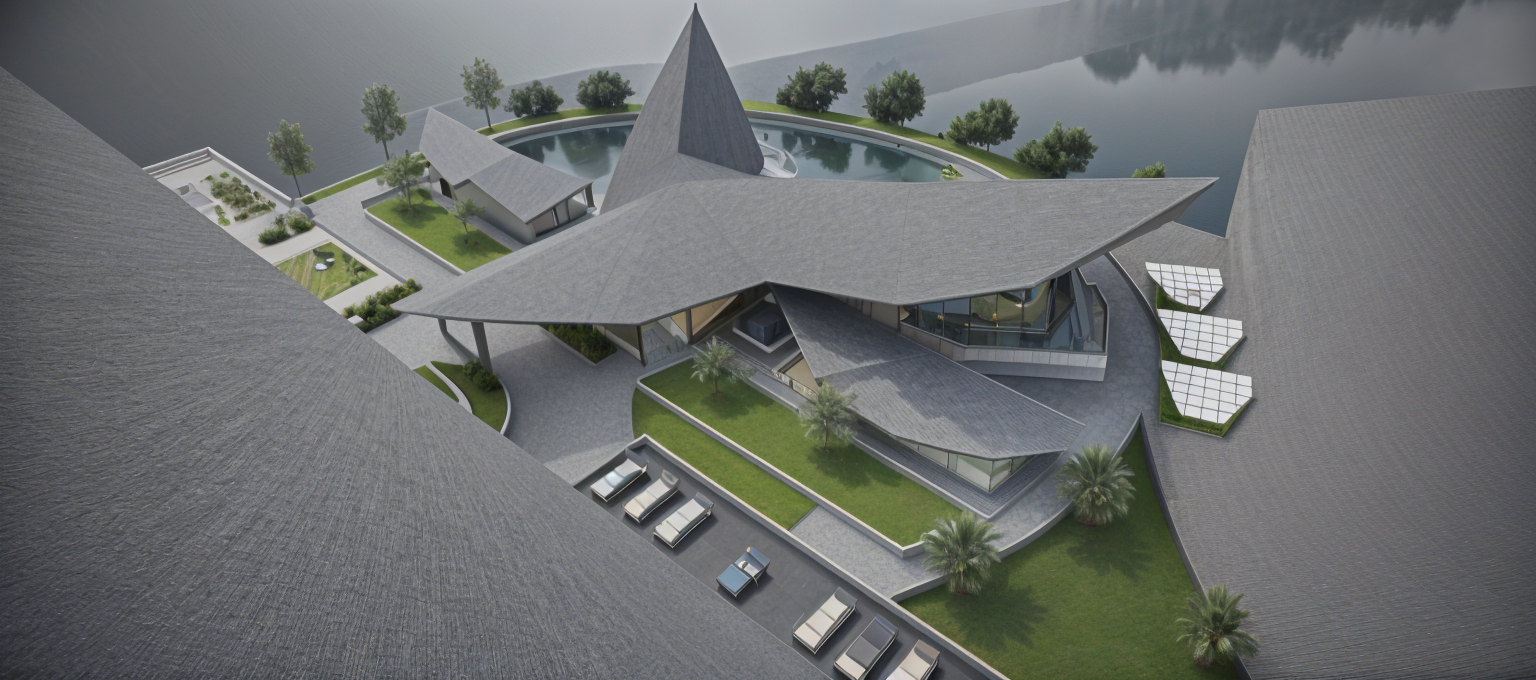 wide angle shot 1 your specialist of making a 3d render realistic 2 thing not to do don t do noting with physical of building don t do noting with roof building 3 things i would like you to do atmosphere warm tree around building lake around area like reference roof wood color realistic natural scene building in lake around with grass field front of building public mainroad architecture
