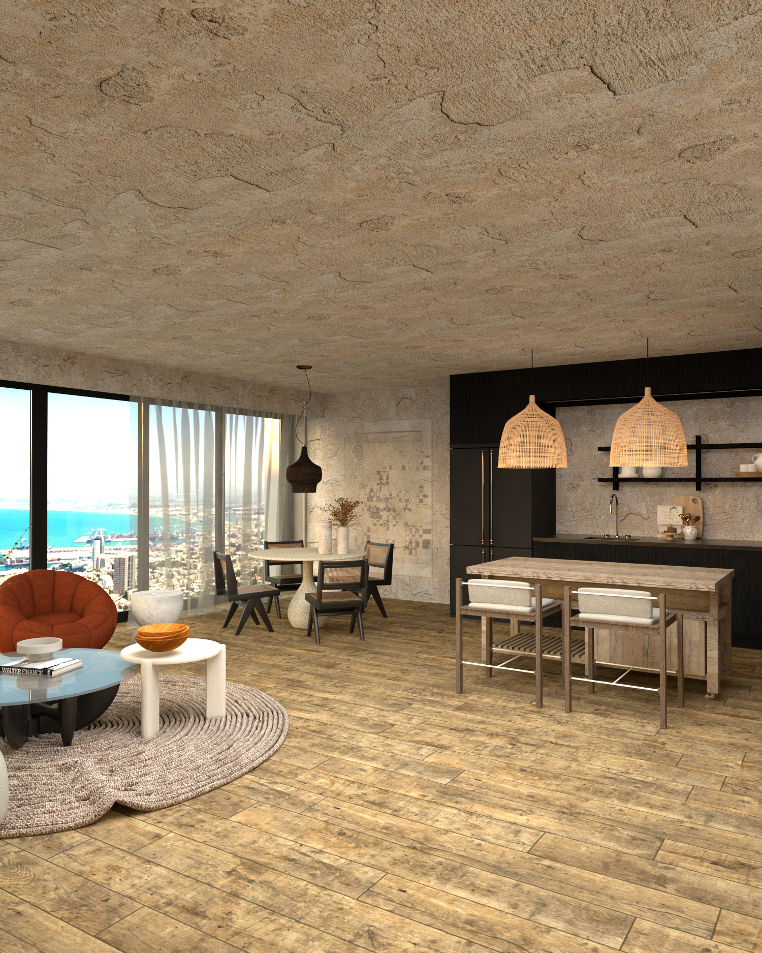 dinning and kitchen with sea vies recycled wood floor black wood cabinet and open shelves concrete plastered walls and ceiling rattan pendant light above the shelves we have black wood cabinets until the ceiling rough wood kitchen island