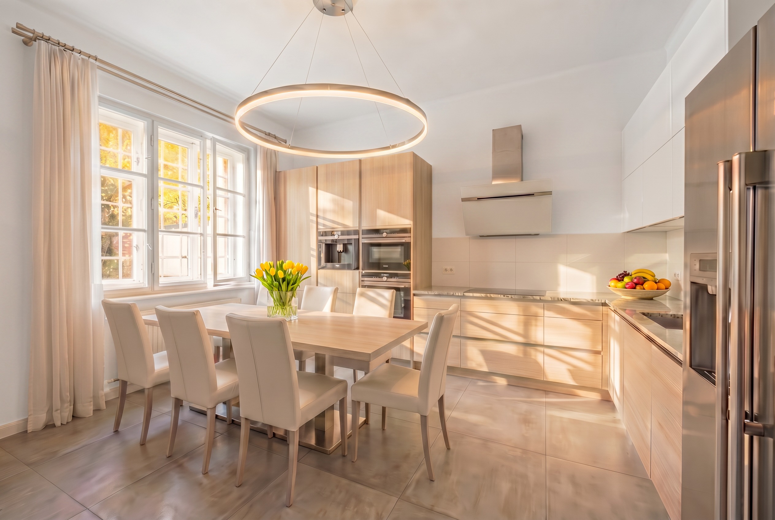vykresli podlahu v dla b 60x60 cm dez n sv tle ed cementi vykresli obklad nad pracovn deskou v barv b l mat vykresli z clony v barv b l vykresli caloun n idl v barv b l brou en k e