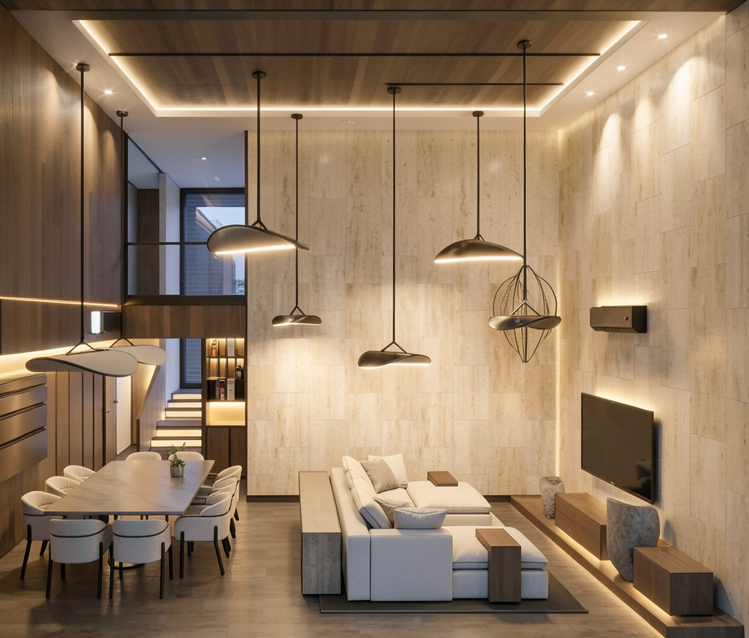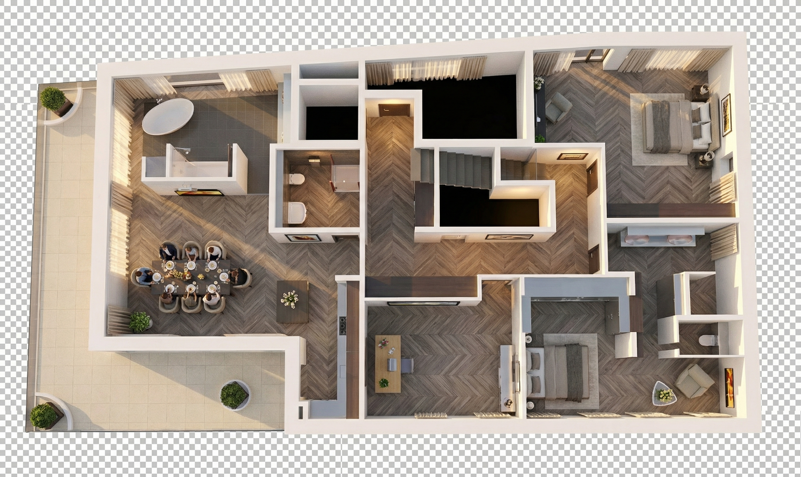 convert this floor plan into a realistic isometric 3d view of a full house show the space from an elevated angle with furniture walls and details visible flooring is white oak 7 wide planks lower cabinets at range stove insert are light white oak cabinets at center island is light white oak all other cabinets are painted white countertop is white carrera marble sink is 30 white farm house layout should match floor plan use the same furniture as shows on the plan do not change the orientation of the floorplan