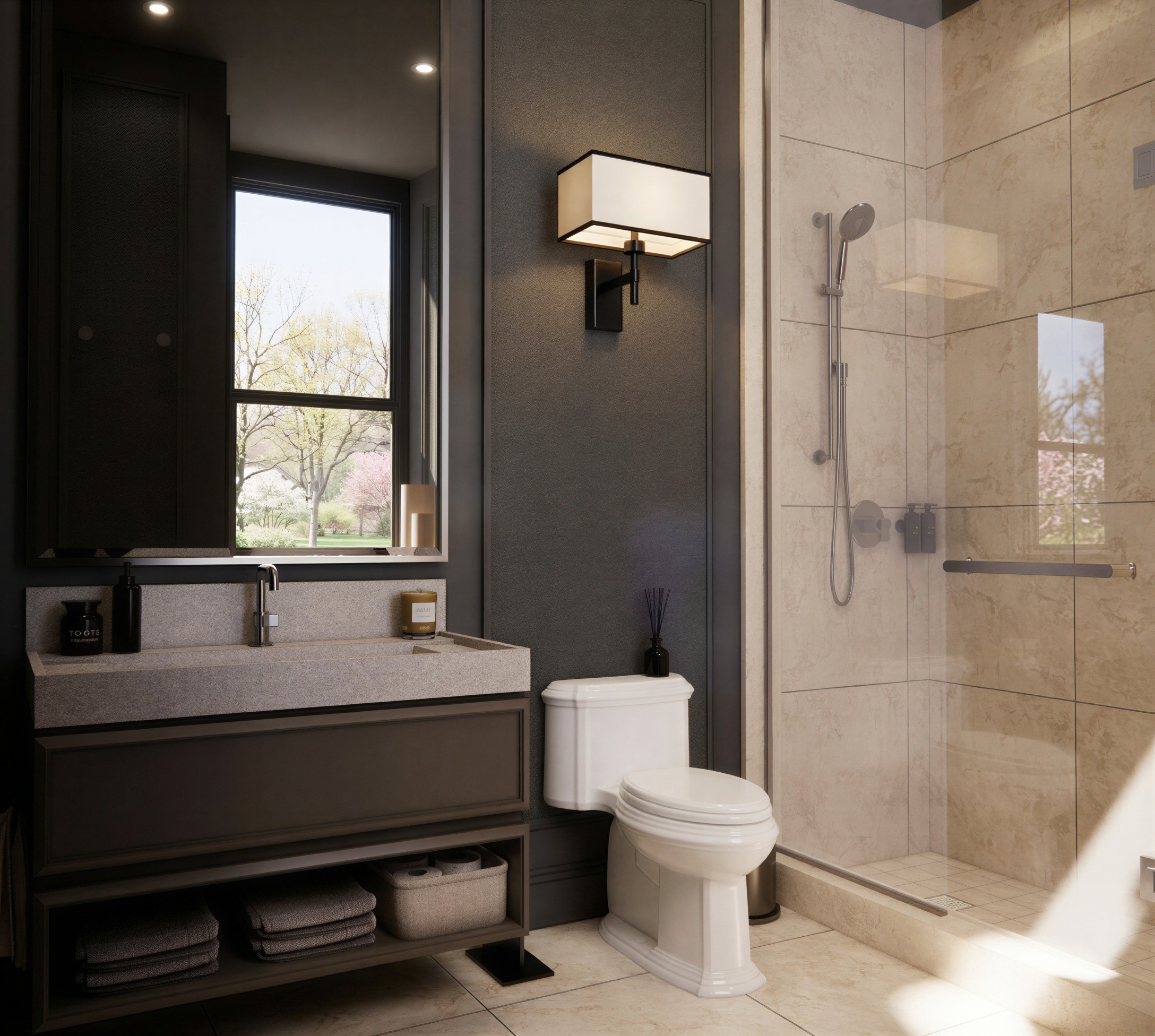 keep everything the same but make change the toilet for a wall mounted model with a black flush