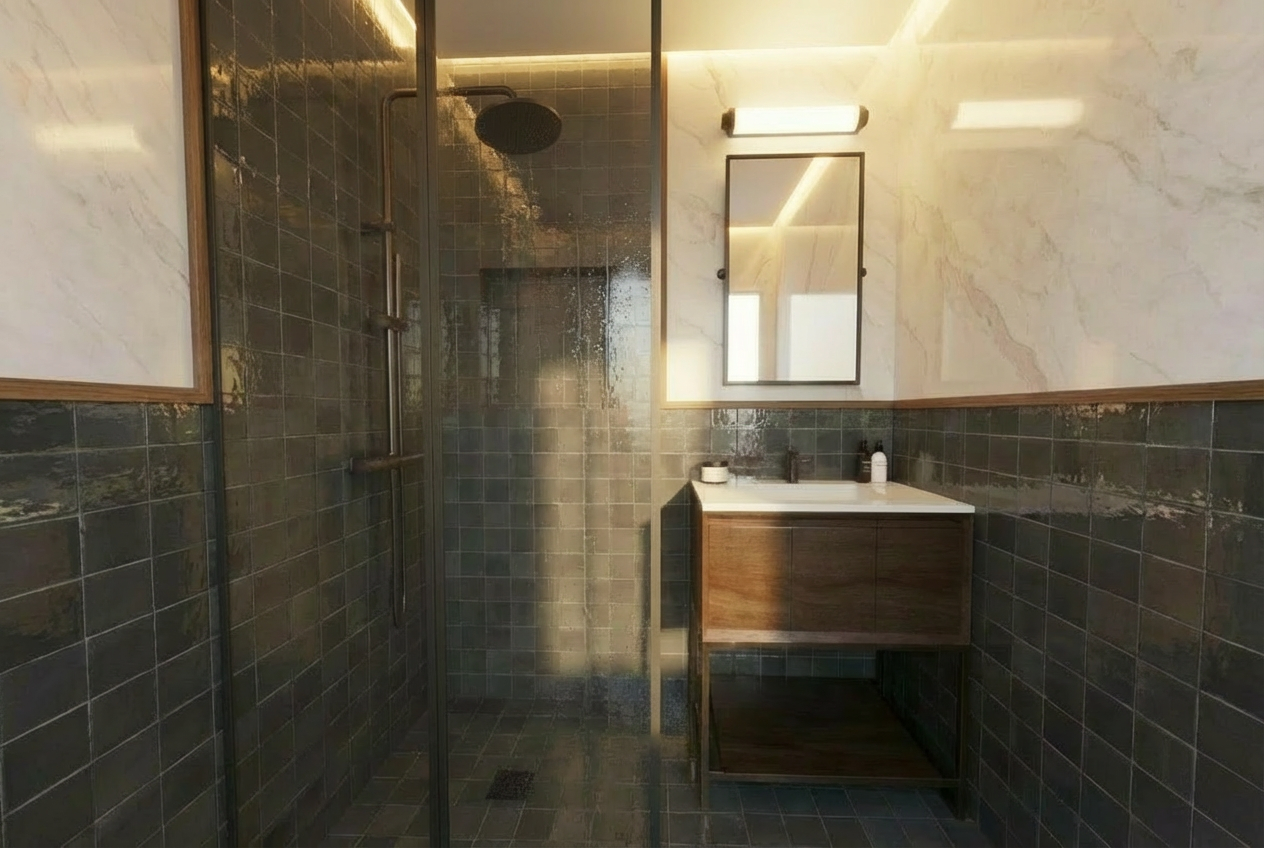 make tiles darker almost black and glossy make all wood lighter tobacco color