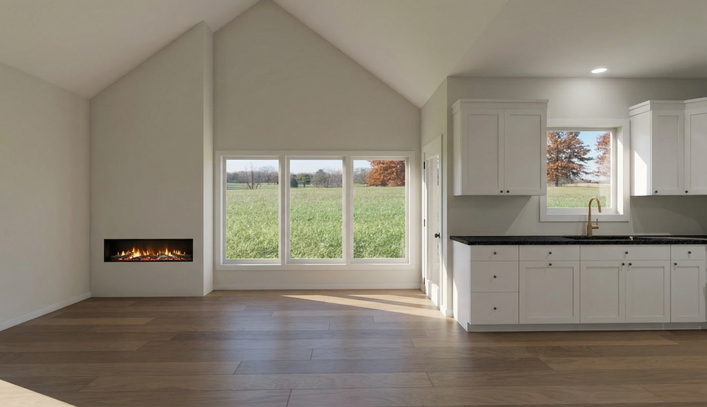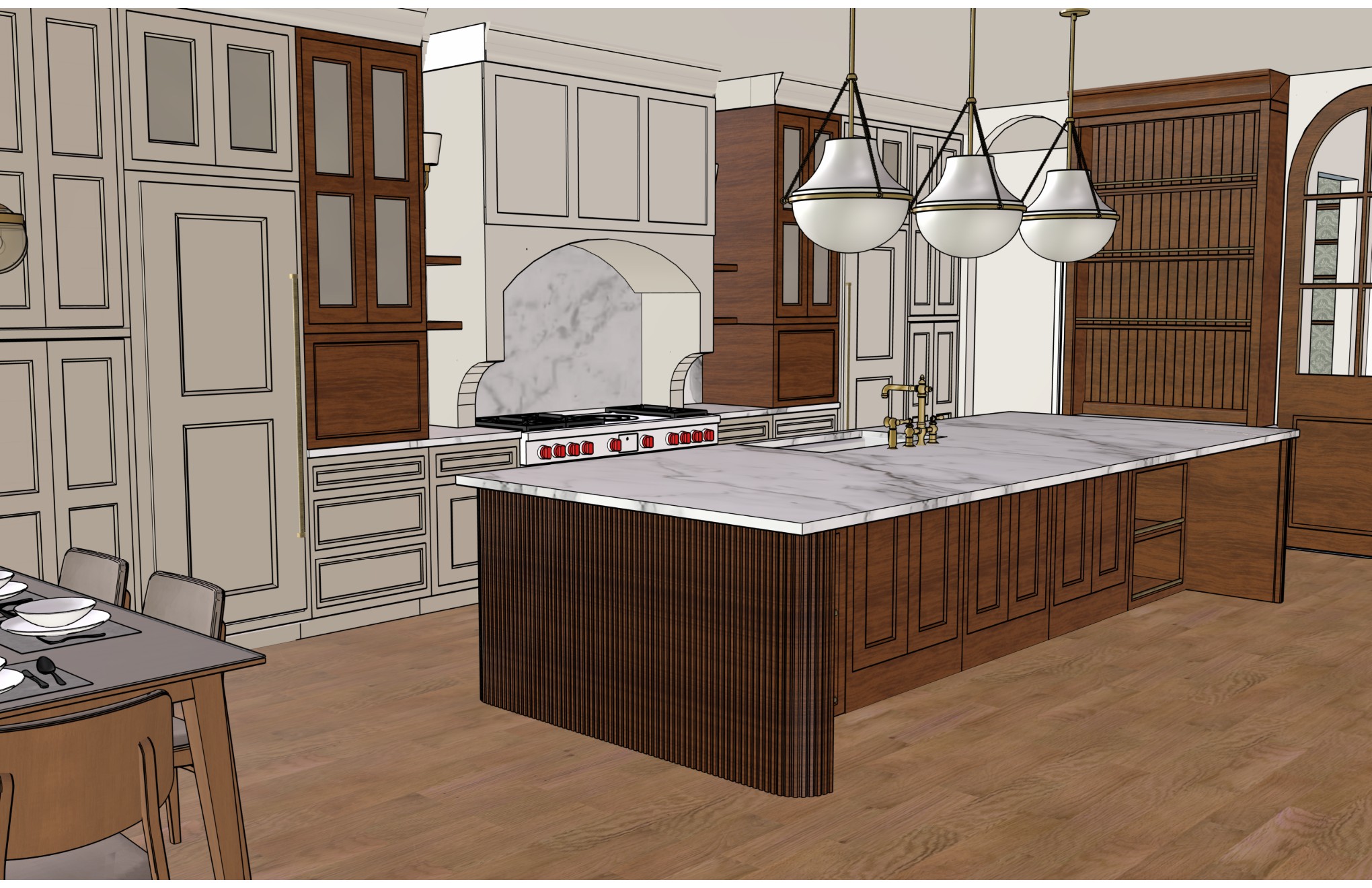 kitchen interior featuring elegant shaker style cabinetry the cabinetry is accented with sleek brass hardware the white marble countertop on the island has grey veining the pendant lights which feature a frosted glass finish with antique bronze fittings the walls are painted in a muted white color complementing the light oak wood flooring the room atmosphere is cozy and inviting with a subtle natural light enhancing the cool tones and creating gentle shadows